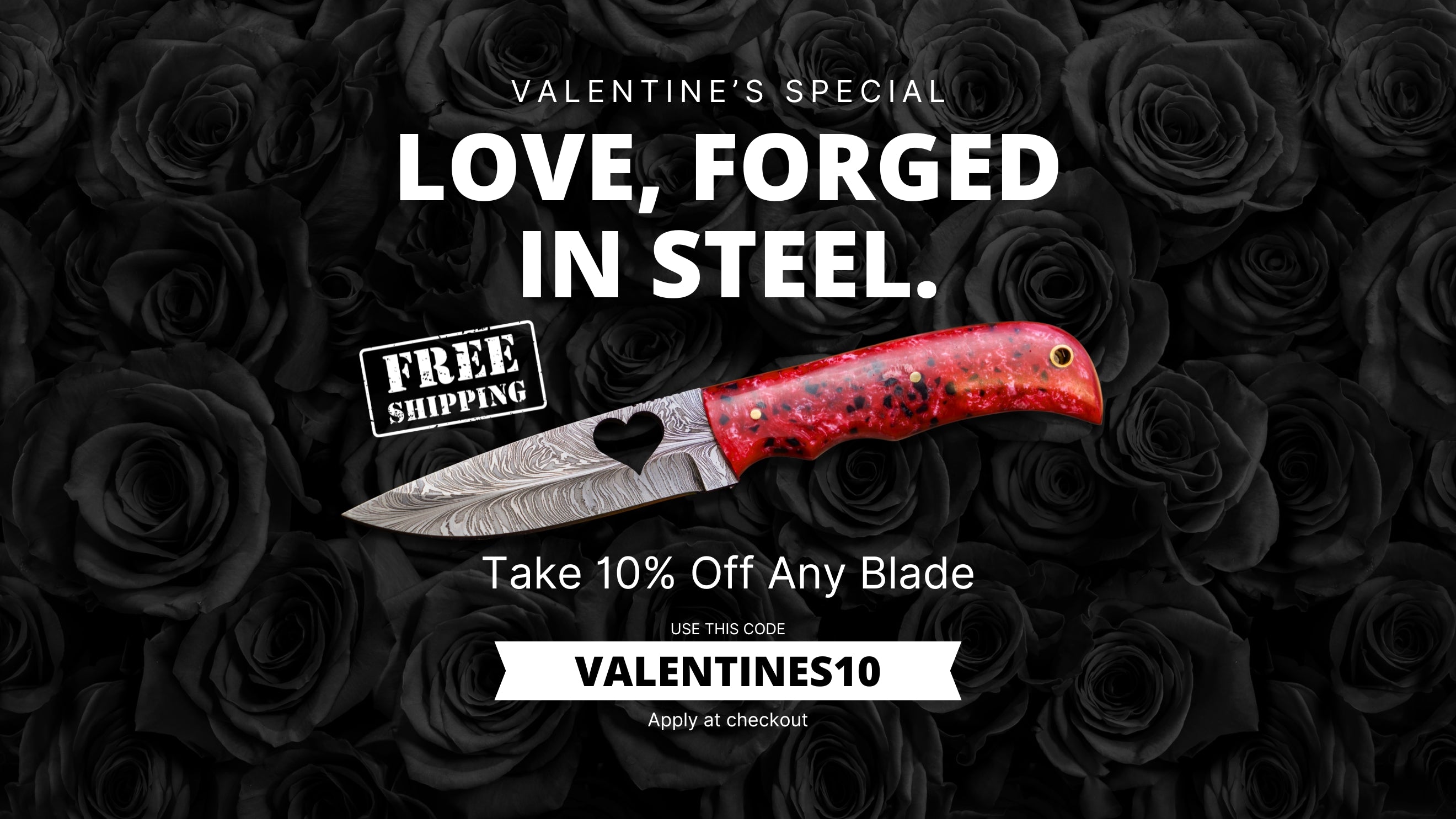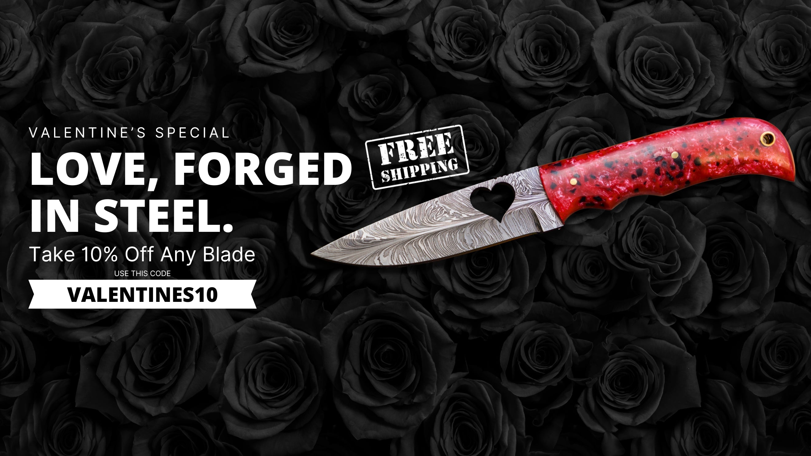 Valentine’s isn’t about ordinary gifts. Make a statement with 10% off any blade plus free shipping including our signature Heart Blade, hand-forged from Damascus steel. Skip the flowers and give something unforgettable.