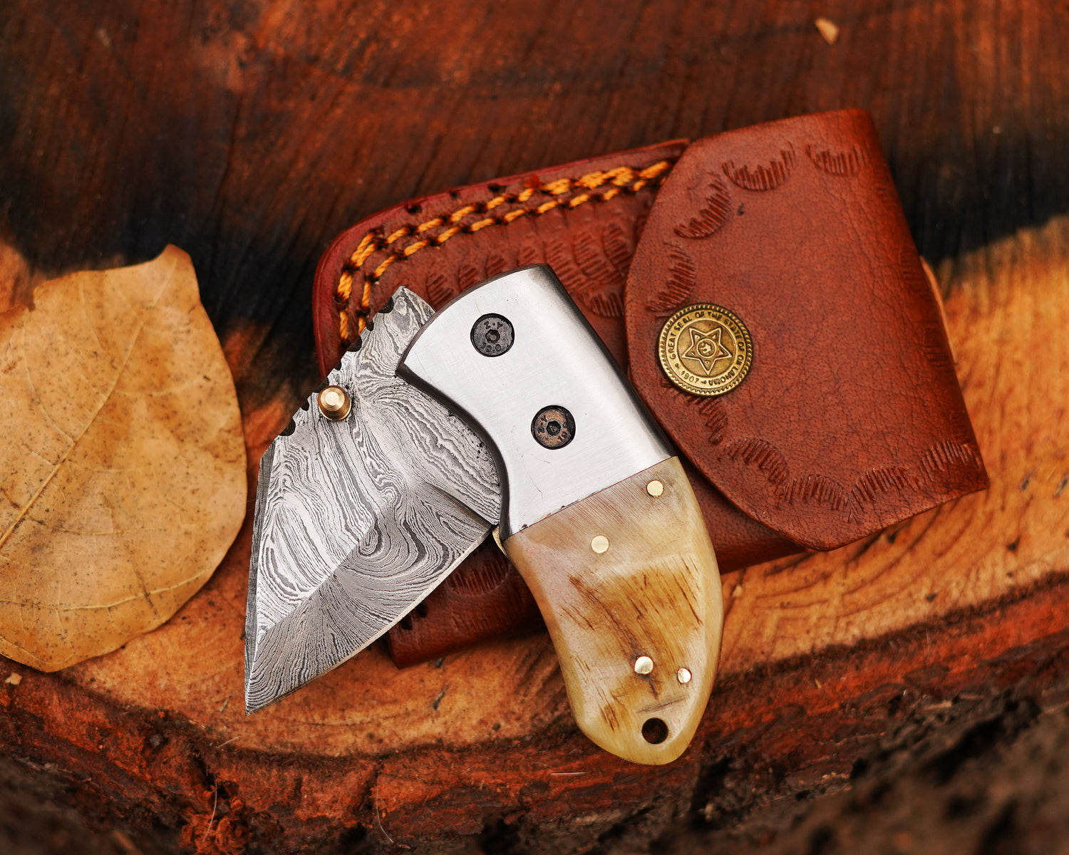 The John Paul Jones Damascus Folding Knife 6.75-inch Bone Handle Knife with Leather Sheath