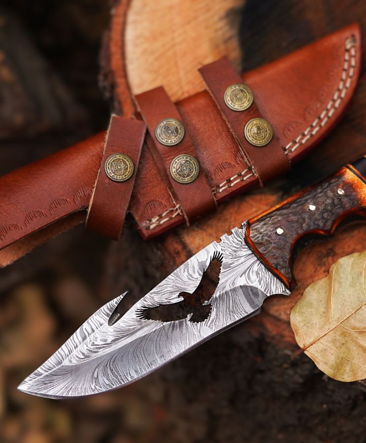 Eagle's Talon: 11.5" Full Tang Hand Forged Fixed Blade Gut Hook Damascus Steel Hunting Knife with Leather Sheath