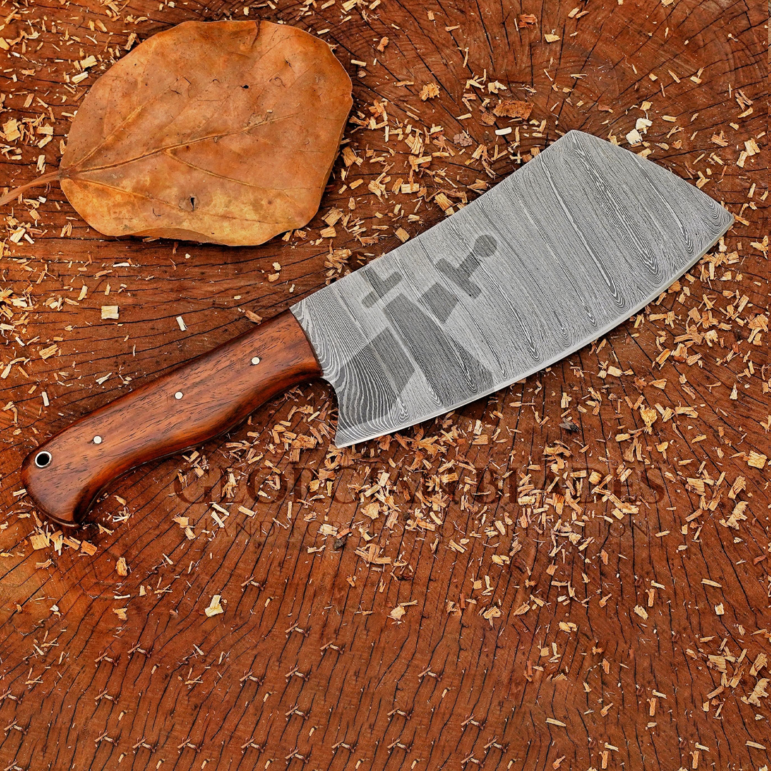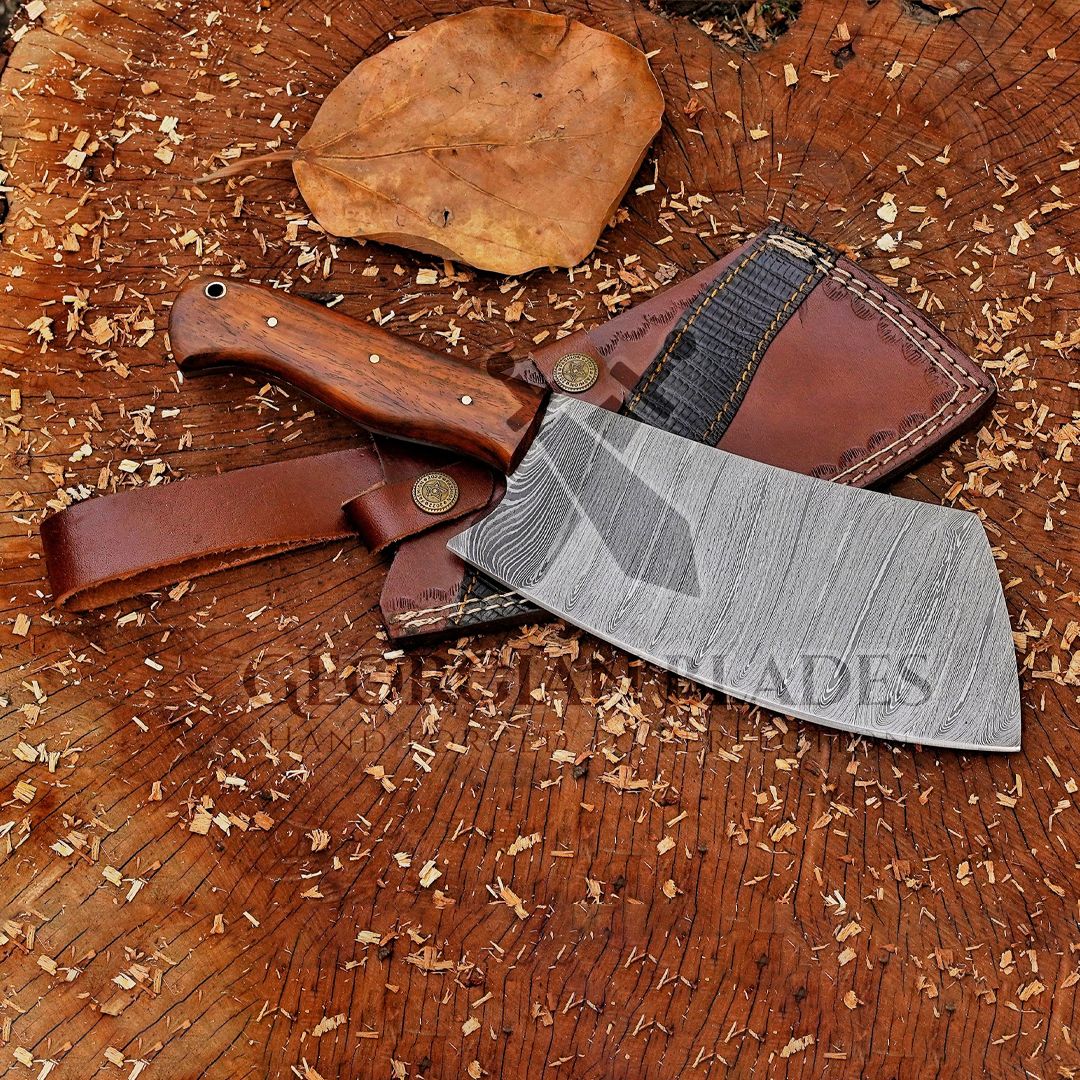 Savage Serenity: 10" Damascus Meat Cleaver with Dark Wood Handle & Leather Sheath, Damascus Steel Cleaver Chopper