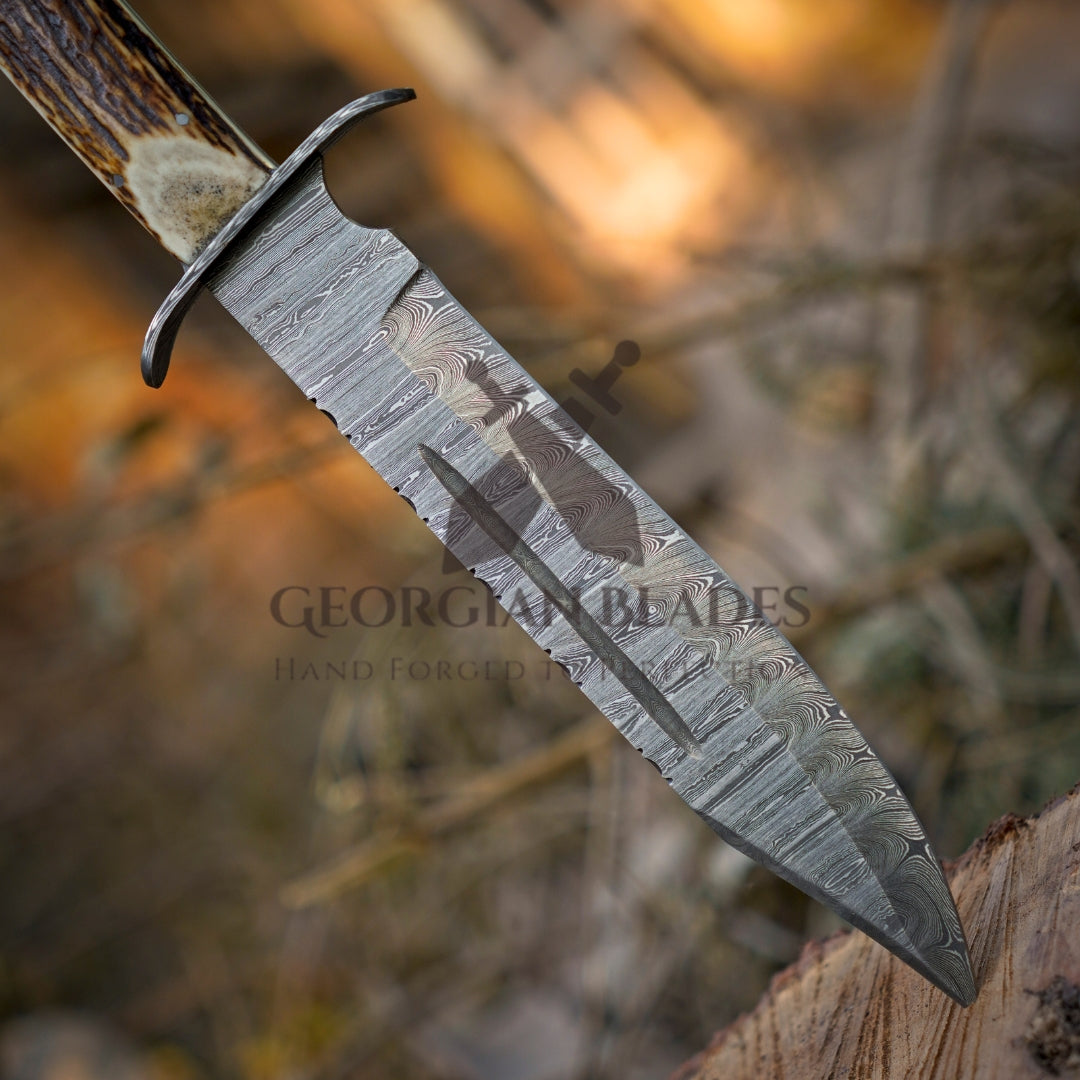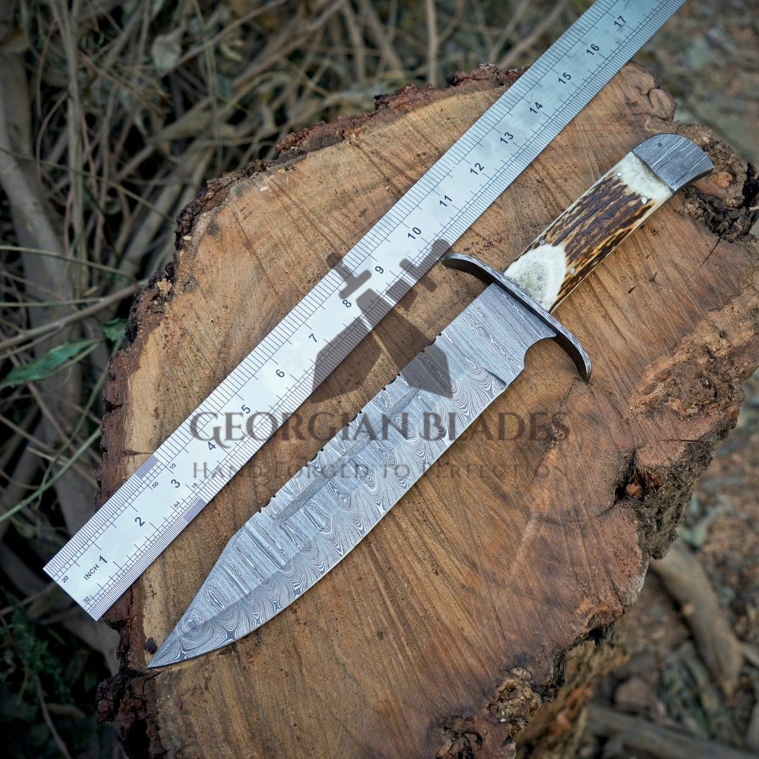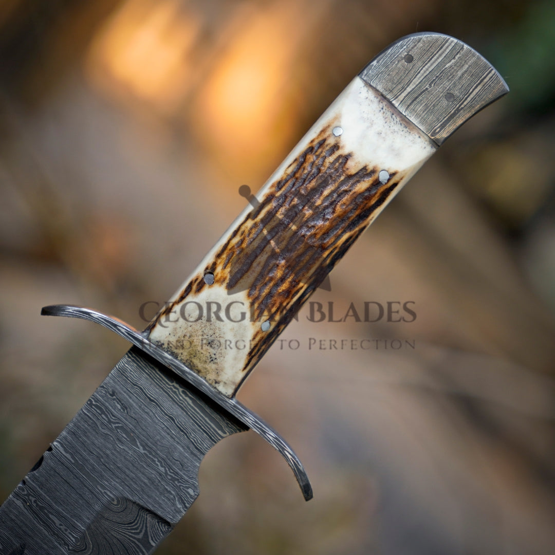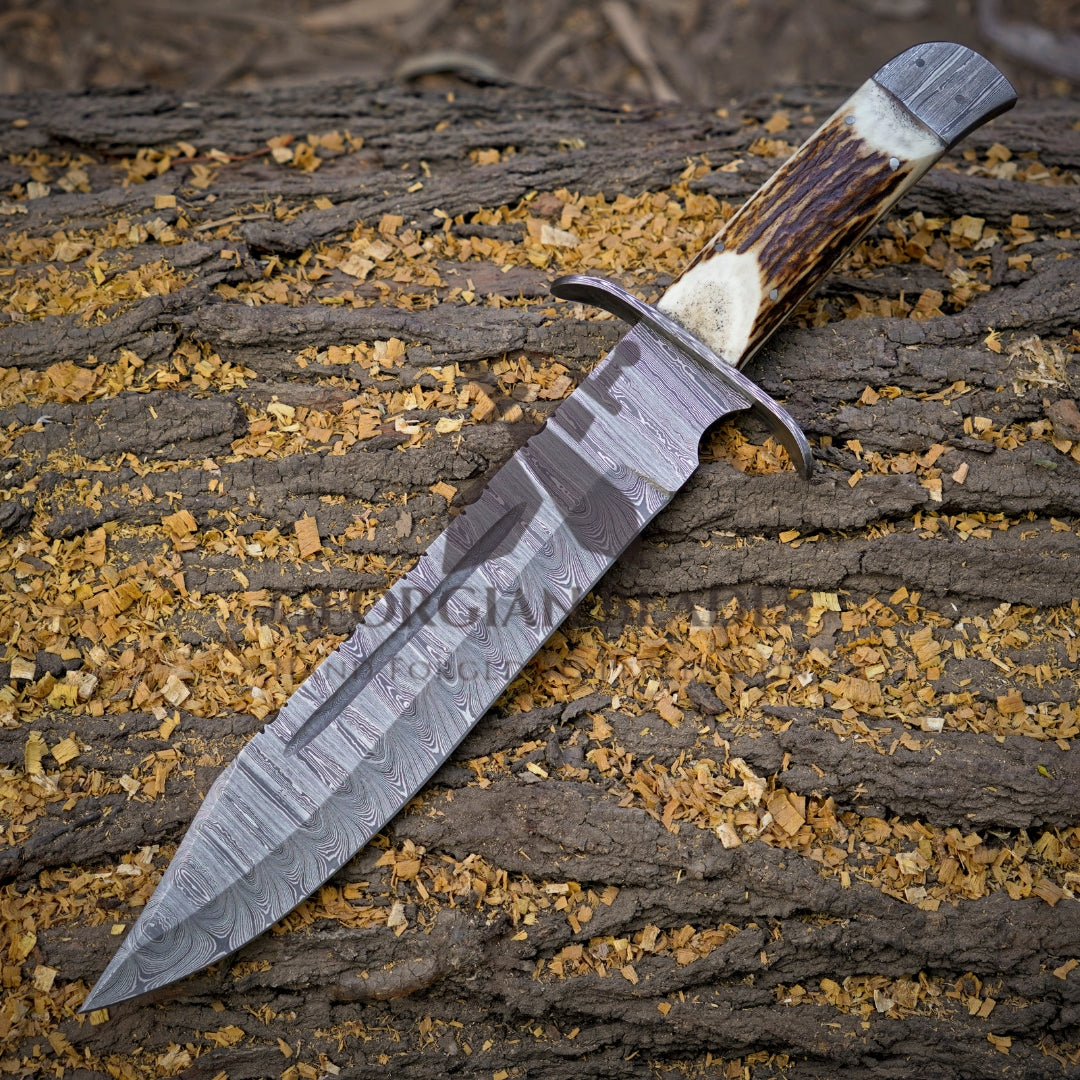 Mountain Majesty: 15" Handmade Damascus Steel Bowie Knife- Full Tang - Stag Antler Handle