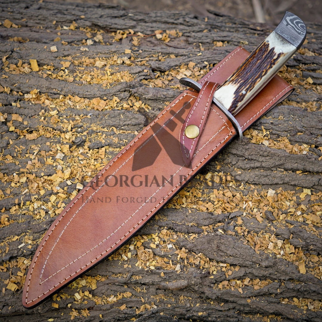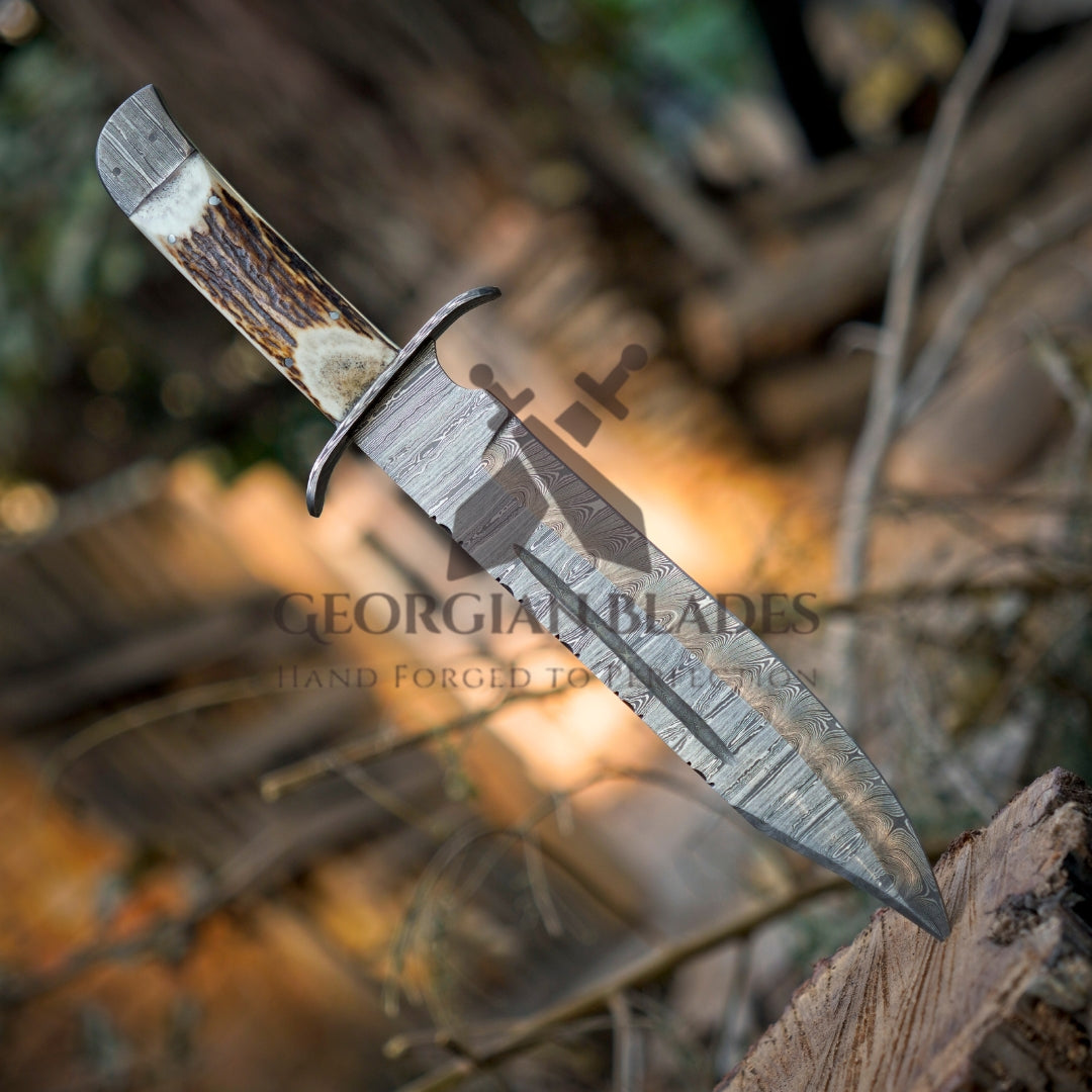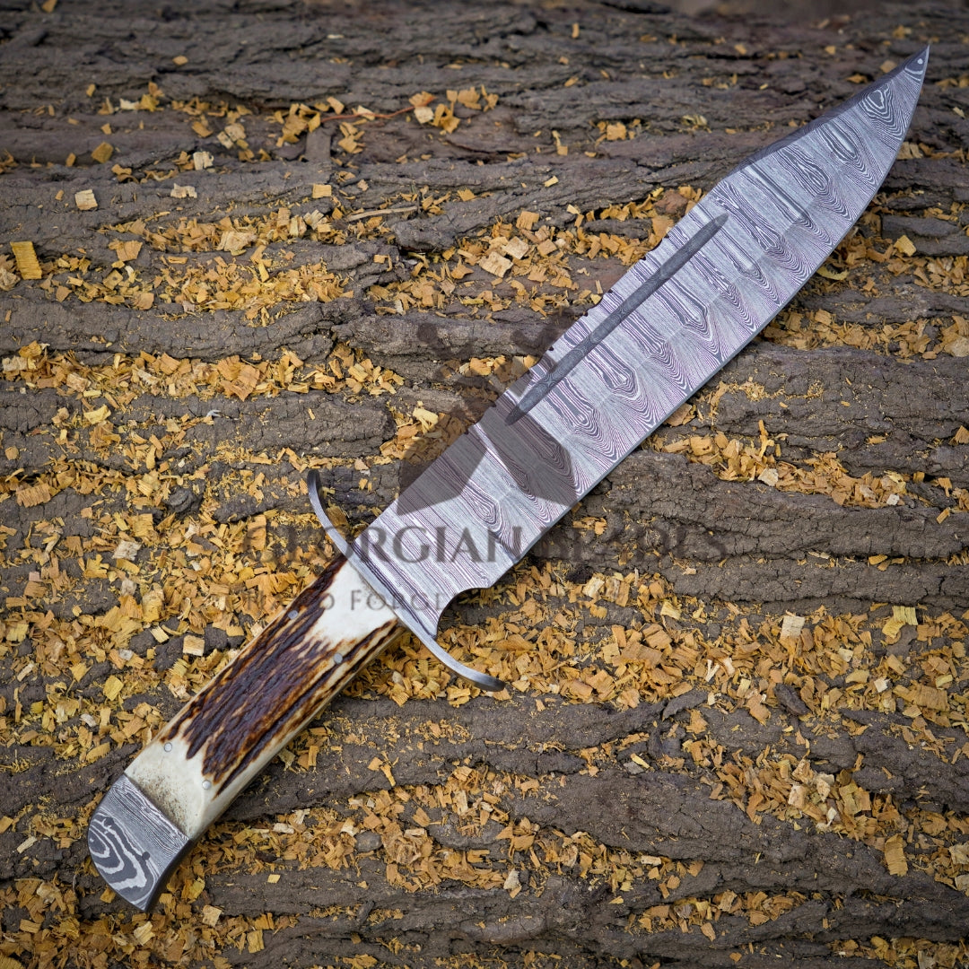 Mountain Majesty: 15" Handmade Damascus Steel Bowie Knife- Full Tang - Stag Antler Handle