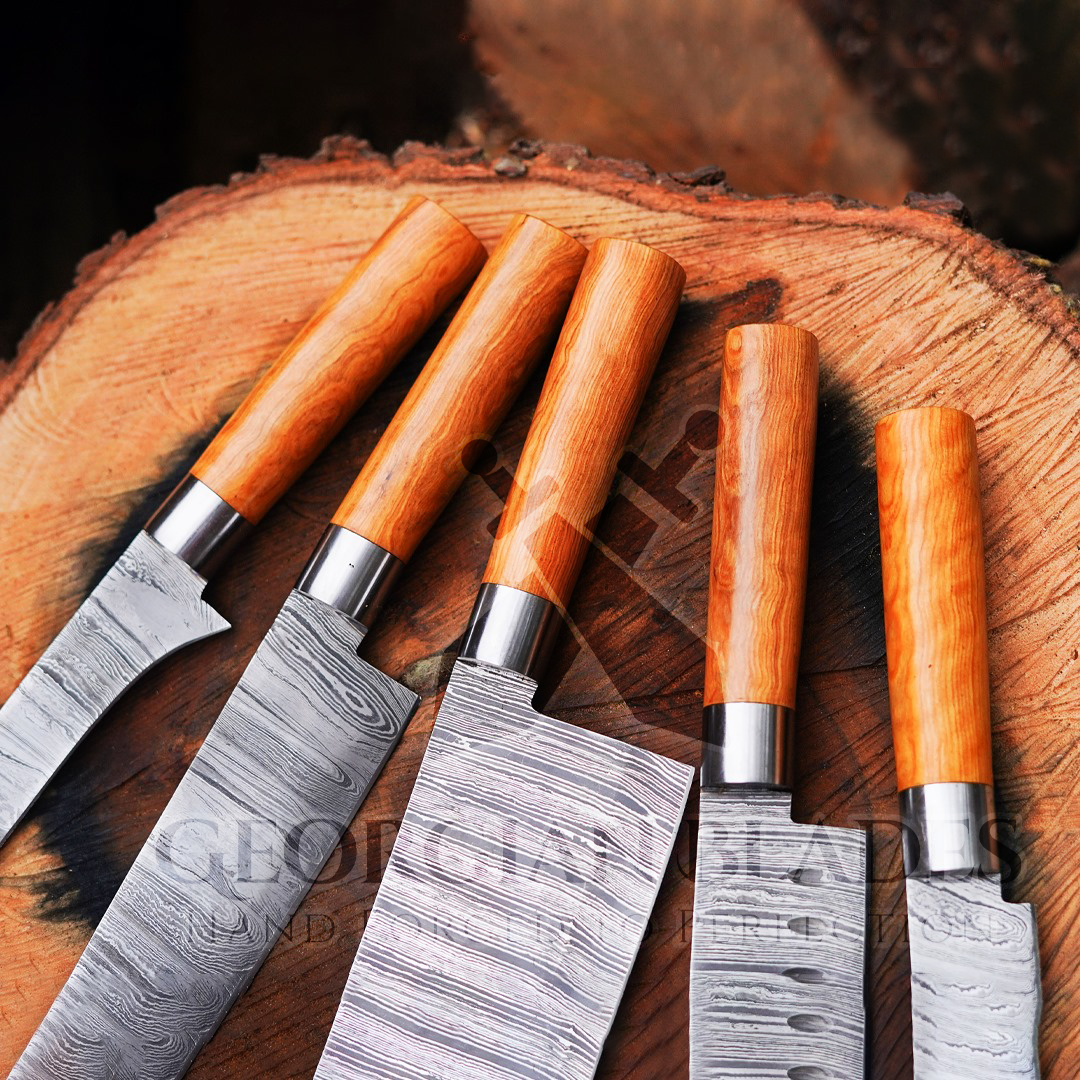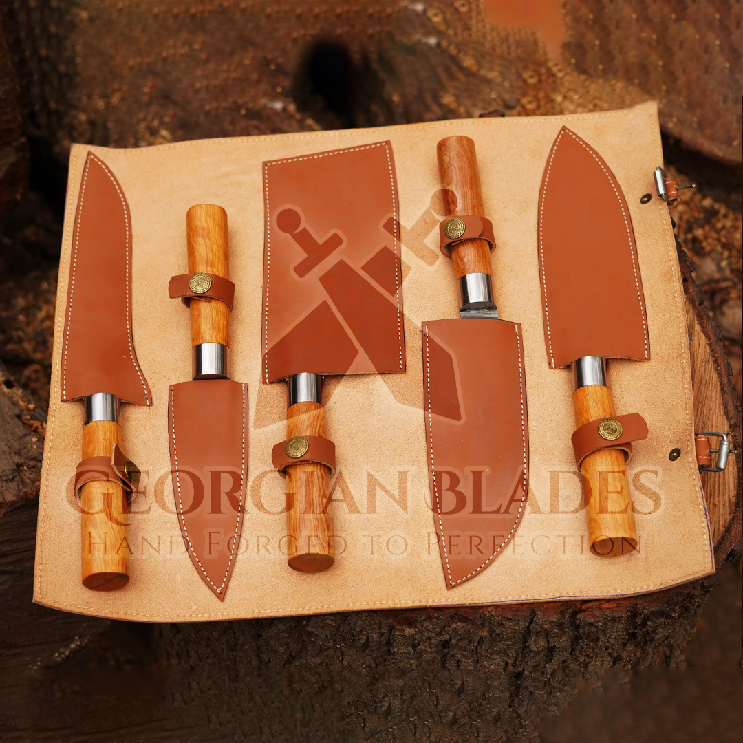 Culinary Connoisseur: 5 Piece Chef Set - Olive Wood Handle & Genuine Leather Role