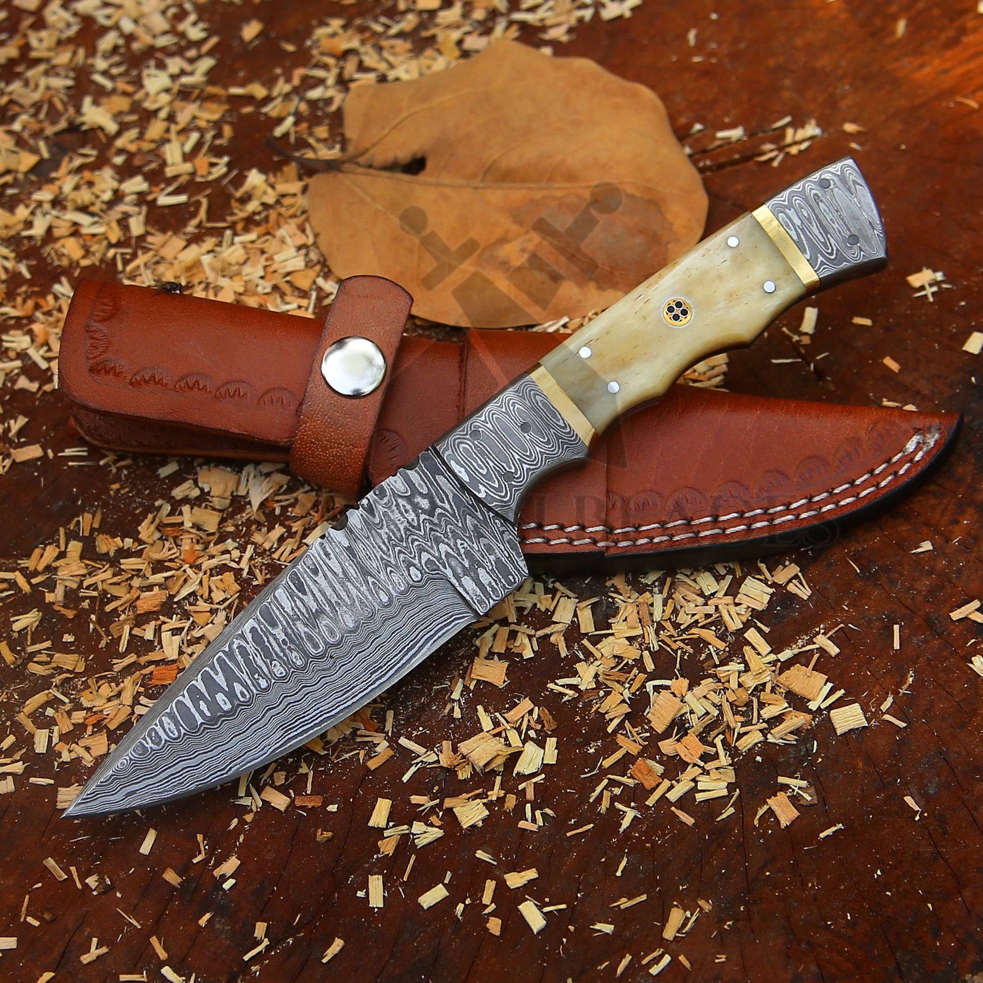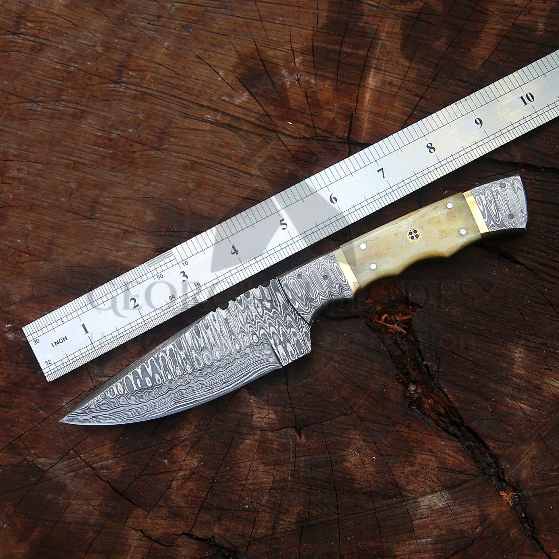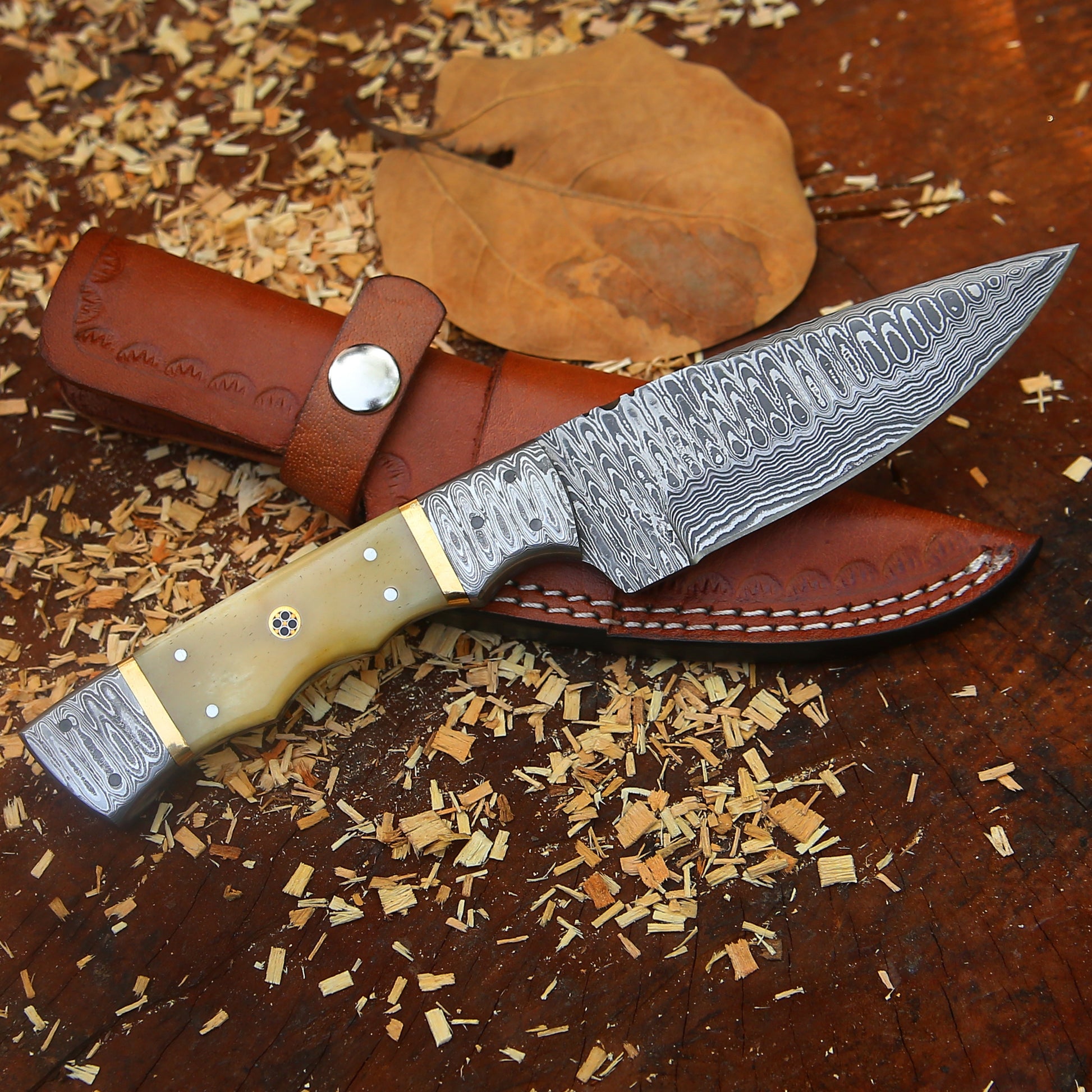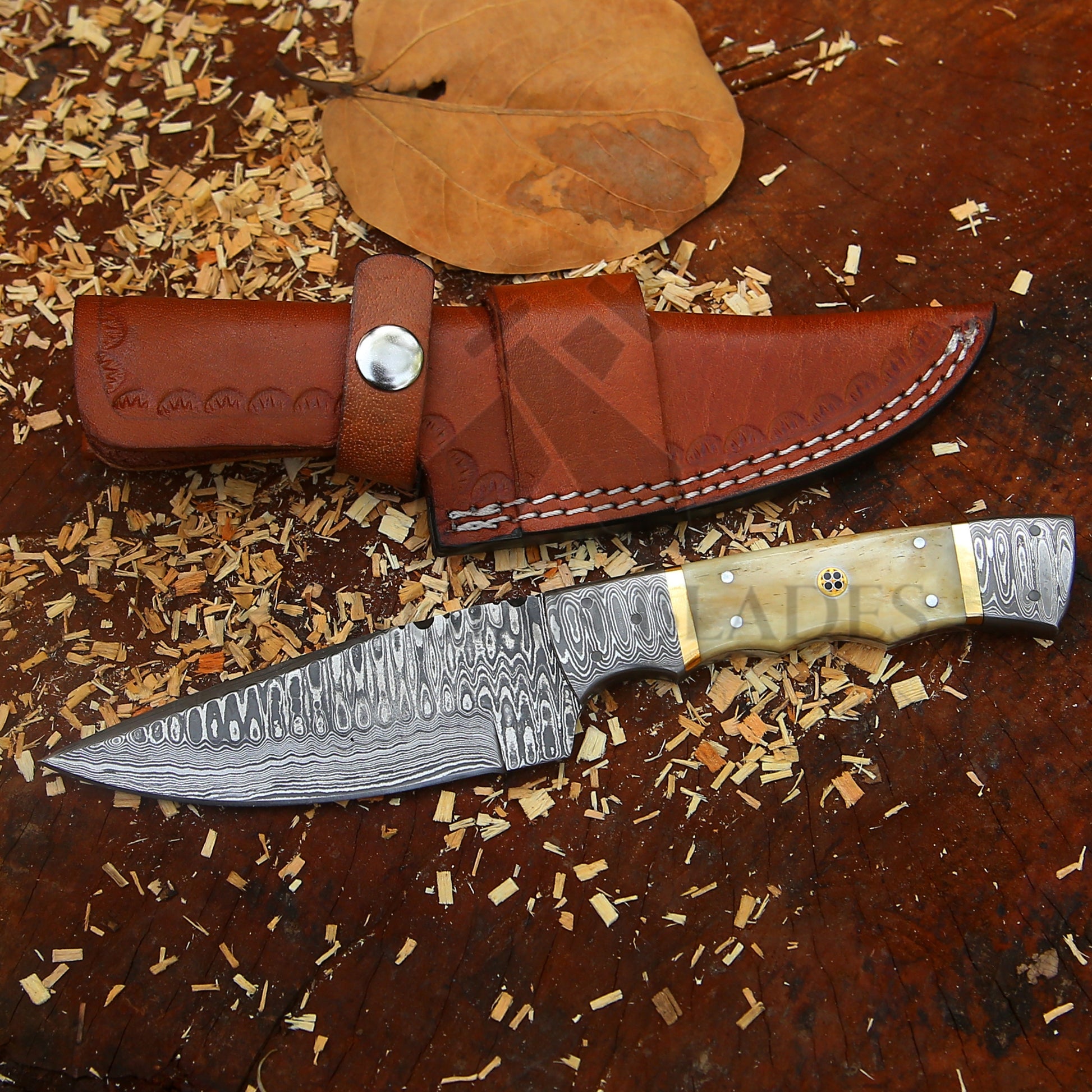 Br'er Rabbit Blade - 9” Hand Forged Damascus Steel Full Tang Skinner Knife - Camel Bone Handle