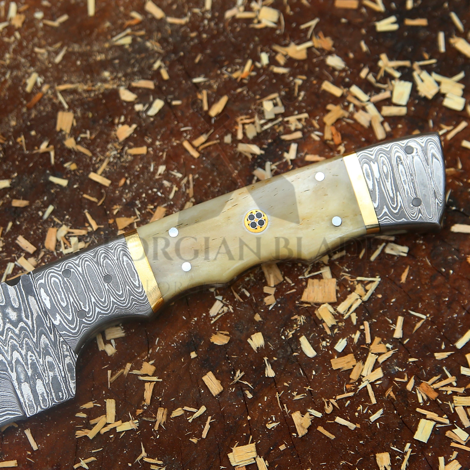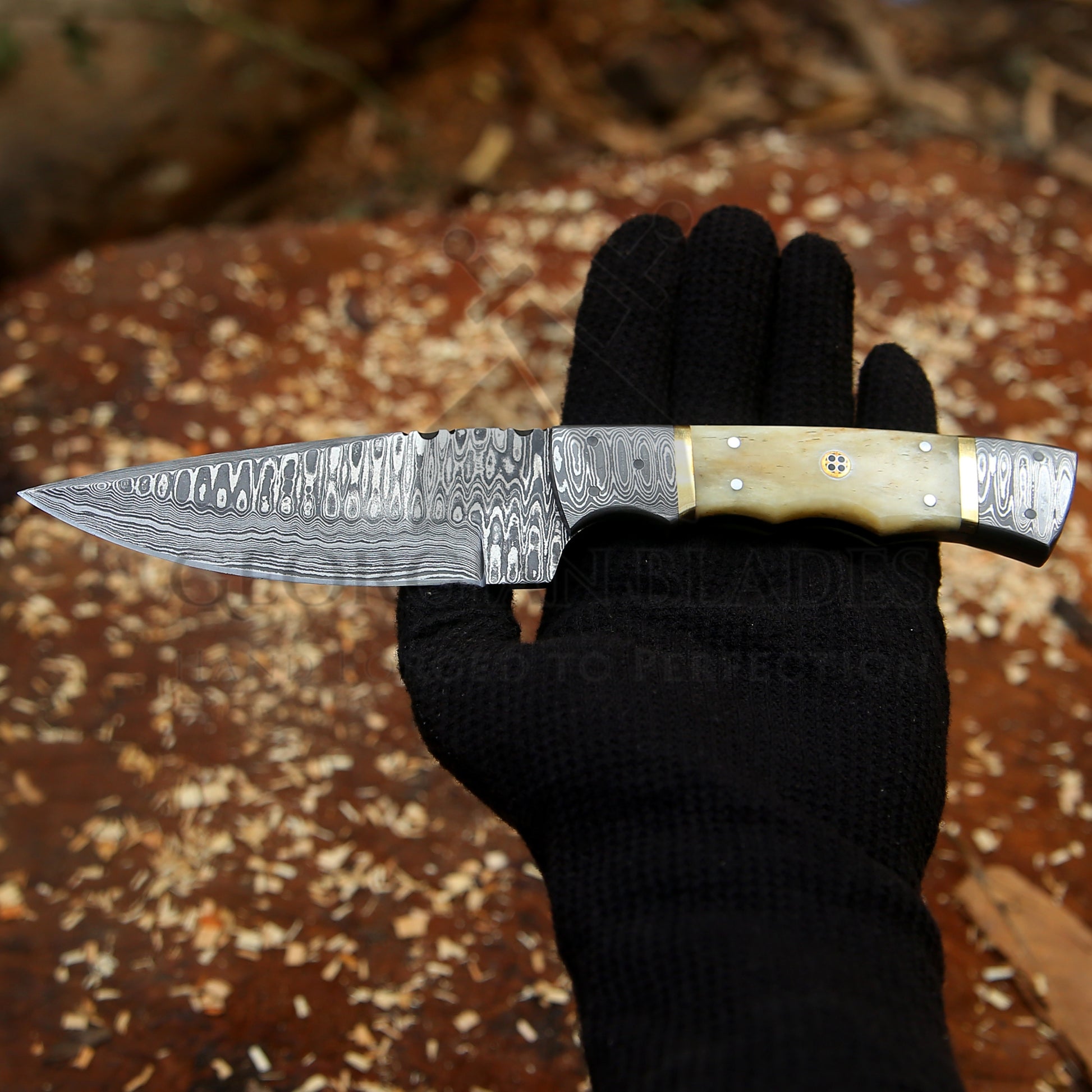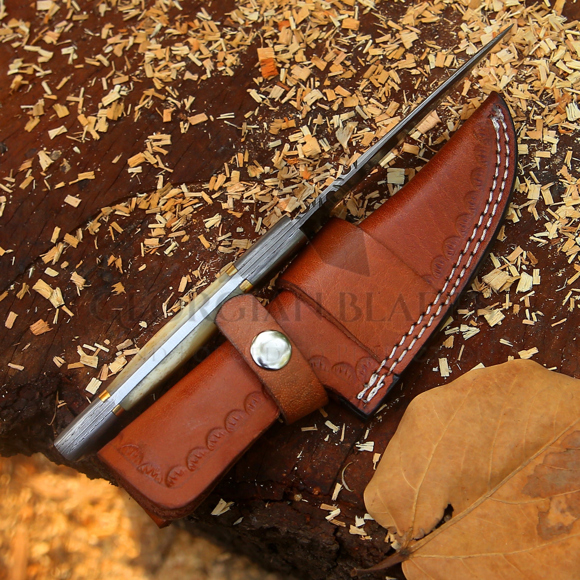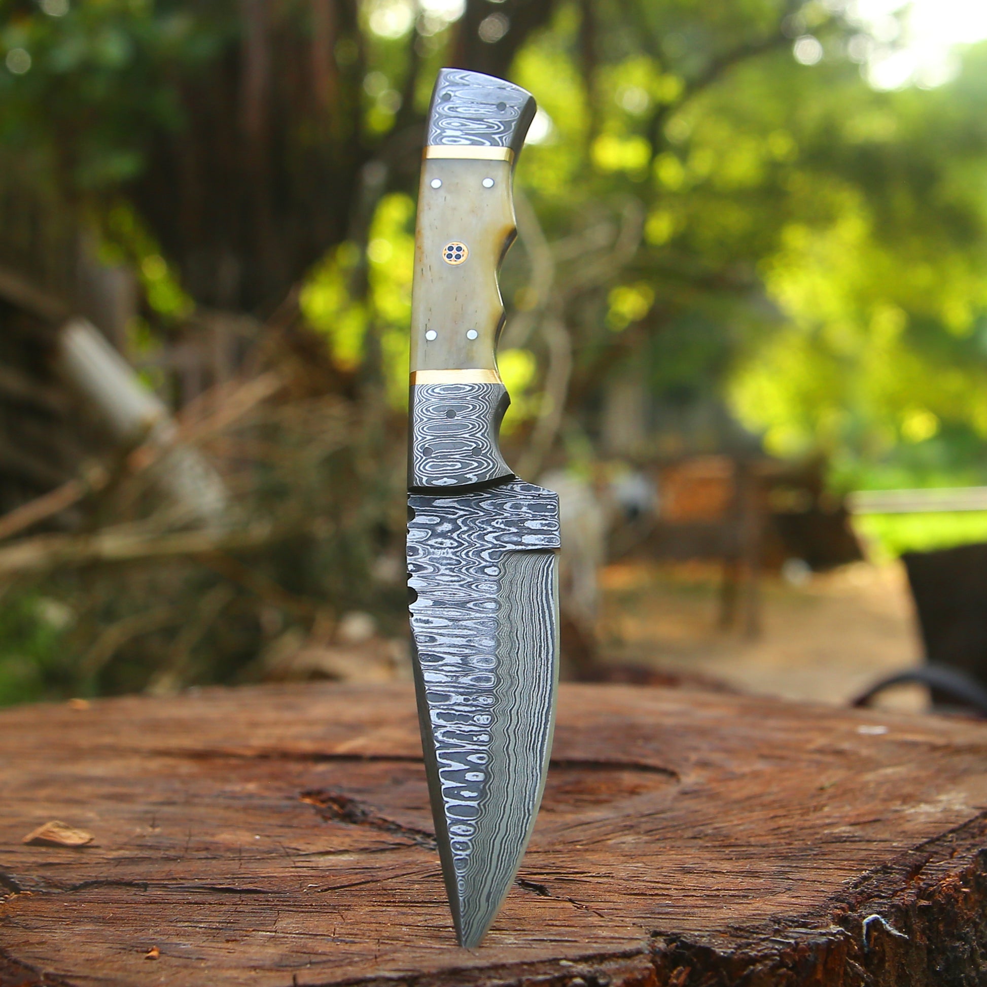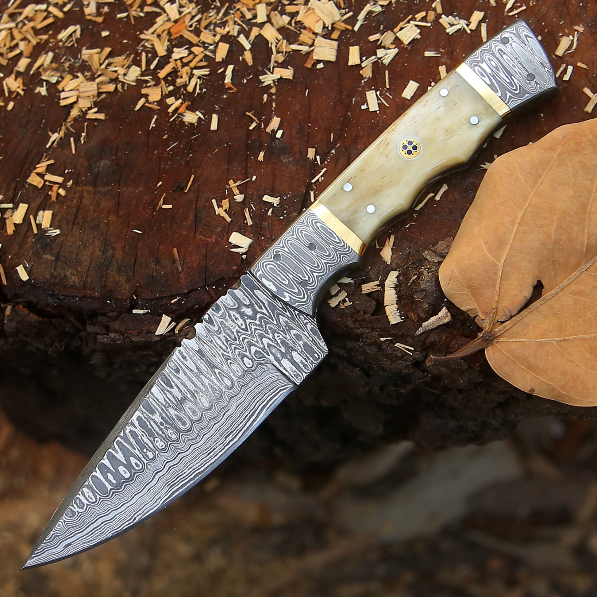 Br'er Rabbit Blade - 9” Hand Forged Damascus Steel Full Tang Skinner Knife - Camel Bone Handle