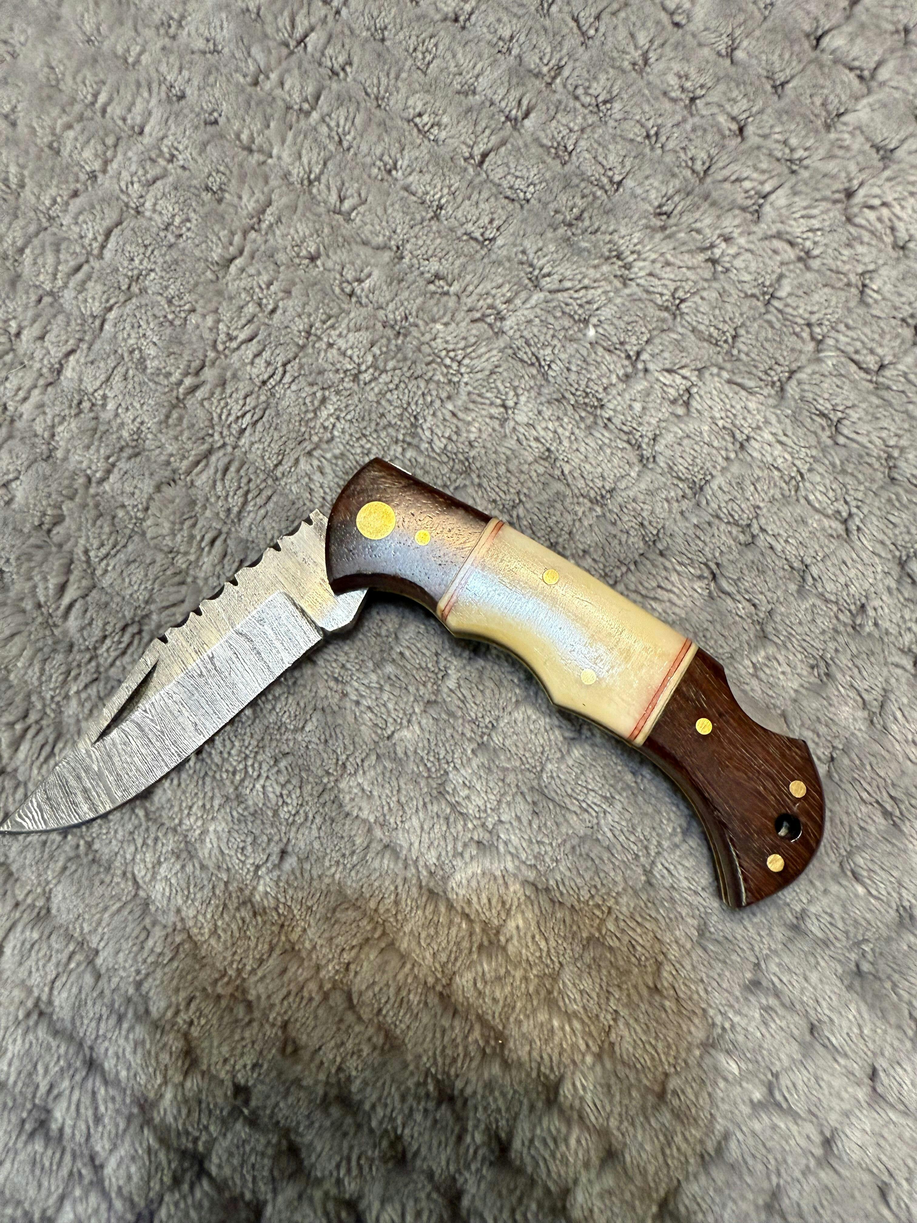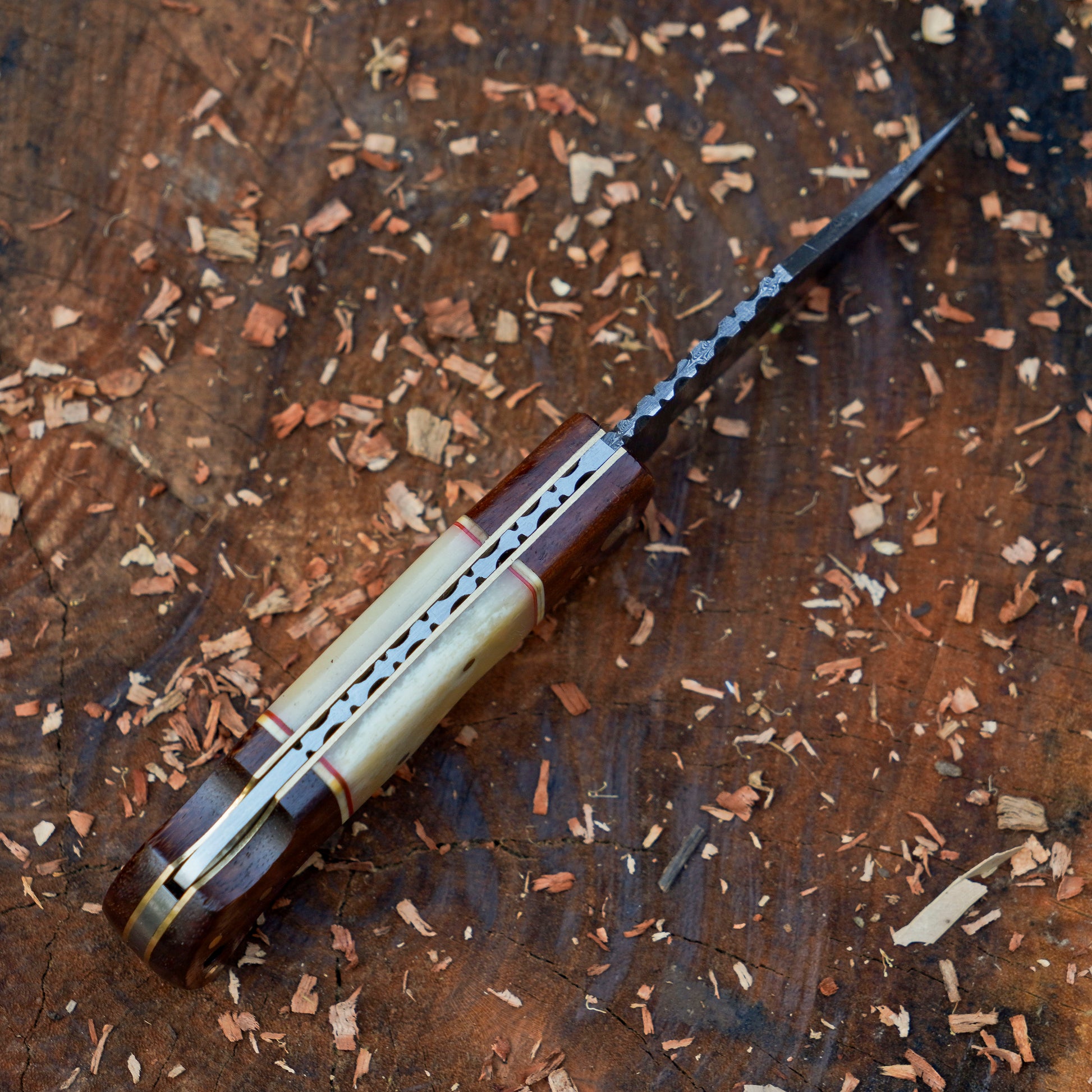Horned Hunter: Custom Forged Damascus Steel Folding Knife Wood & Bone Handle