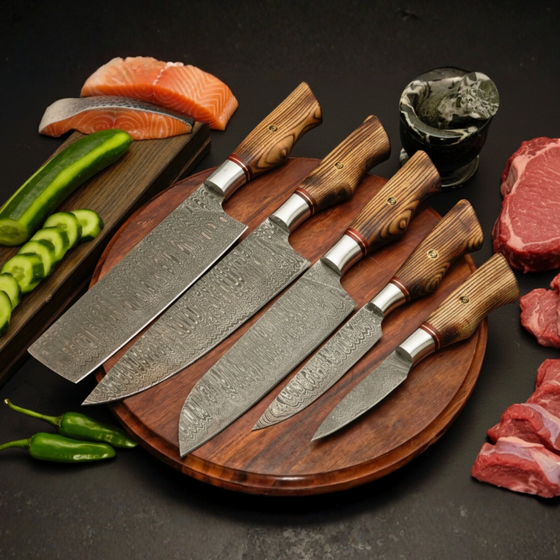 The Damascus Heirloom Series - Signature Chef Collection is a handcrafted five-piece chef knife set designed for precision and professional performance. Each knife features a burned ashwood handle with an aluminum bolster, brass and red pakkawood spacers, and a mosaic pin. The set includes a premium leather roll for storage and protection.