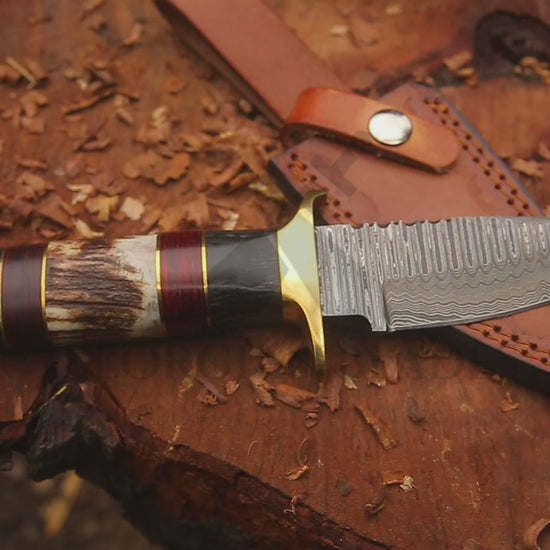 Discover the Shadowfang Hunting Knife, a perfect gift for anniversaries, birthdays, and special occasions. Handcrafted with a 4-inch Damascus steel blade and a 5-inch stag horn handle, this knife combines beauty and functionality. The included leather sheath ensures protection and easy portability.