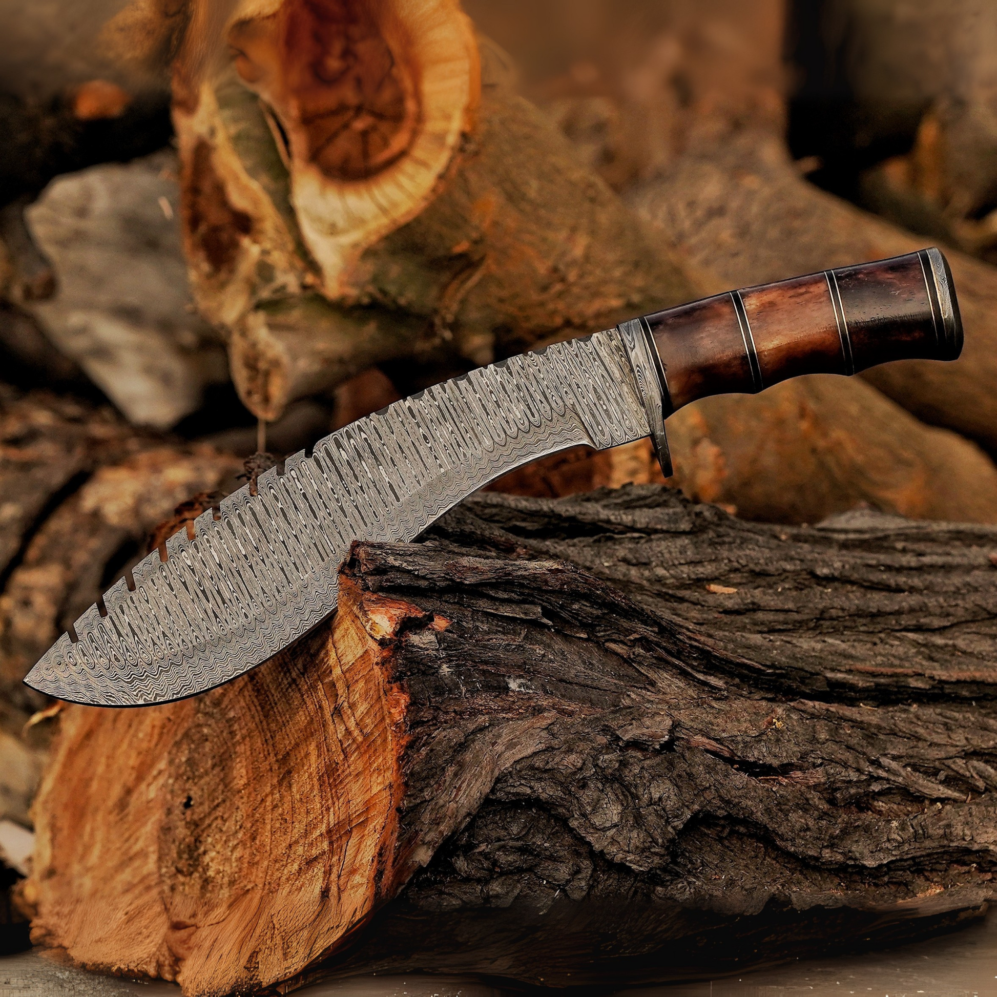 Forge tradition and performance together with the Emberwood Kukri, a hand-forged Damascus steel knife designed for hunters, campers, and collectors who demand both striking beauty and rugged strength. Its dramatic curve and ladder-pattern Damascus blade deliver unmatched cutting power and a bold visual statement.