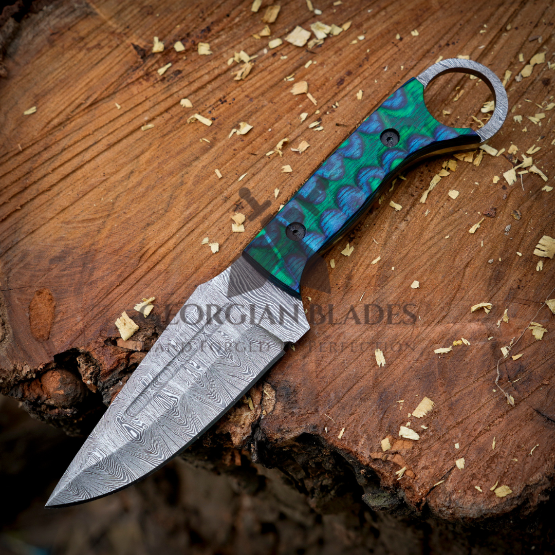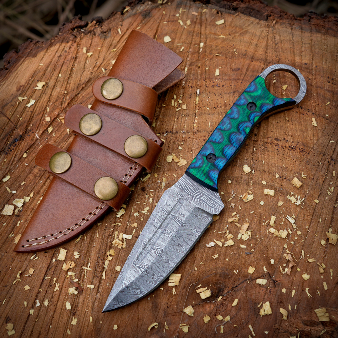 Mystic Blade - Hand-Forged 9" Damascus Steel Hunting Knife with Colored Resin Handle and Leather Sheath– Perfect for Outdoor Enthusiasts