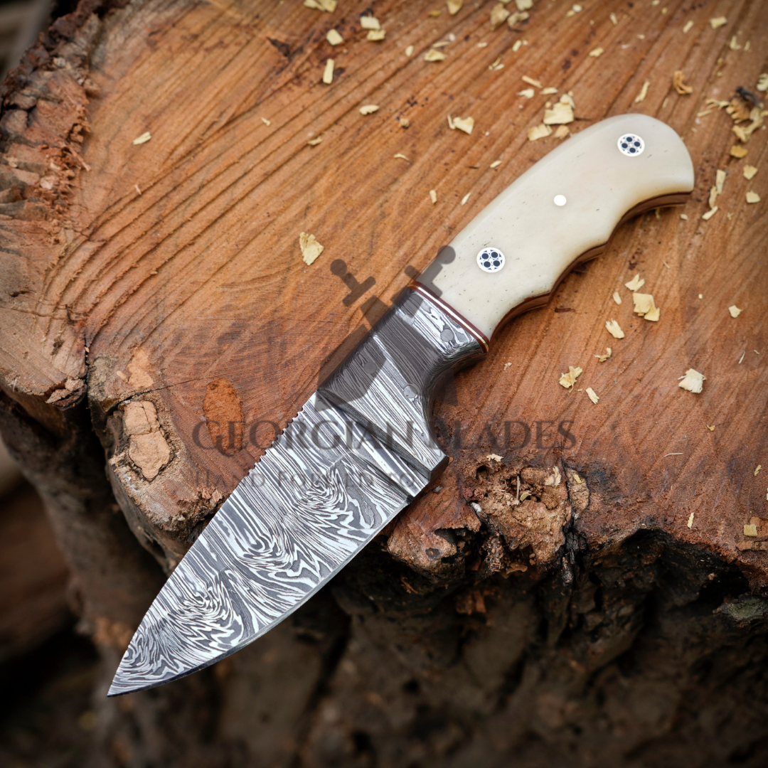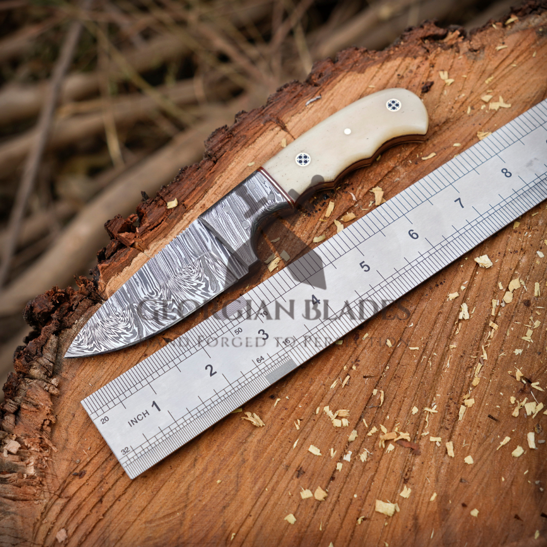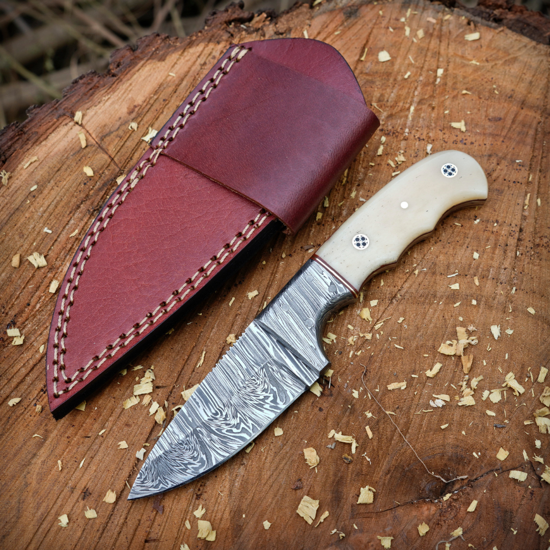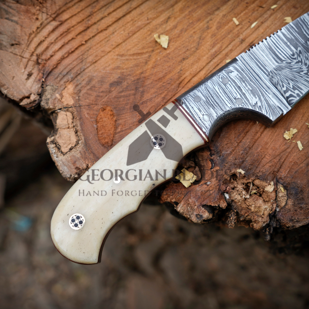 John Henry Slicer - 7.25” Hand Forged Damascus Steel Full Tang Skinner Knife - Camel Bone Handle