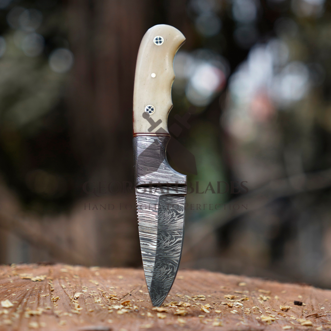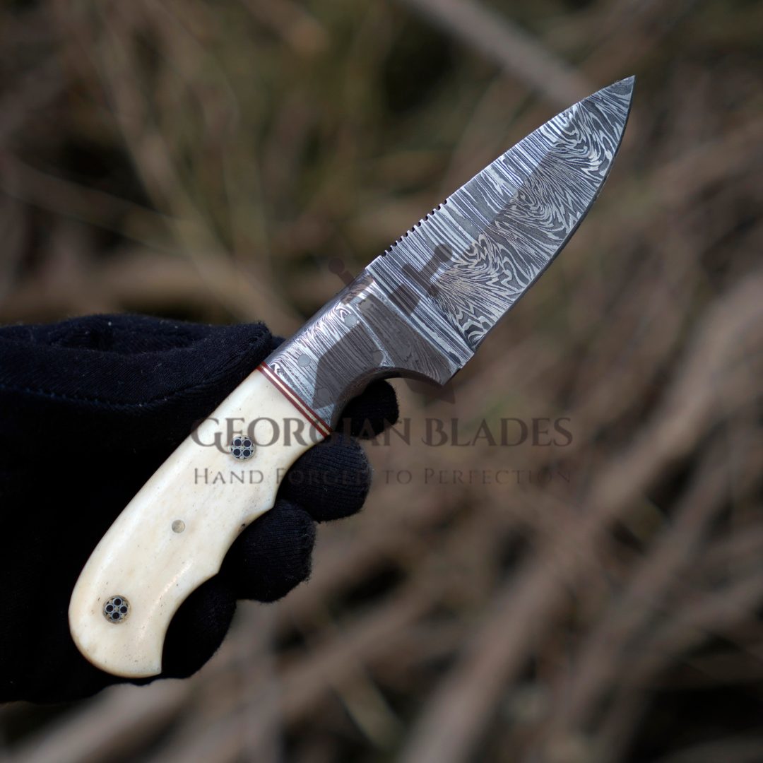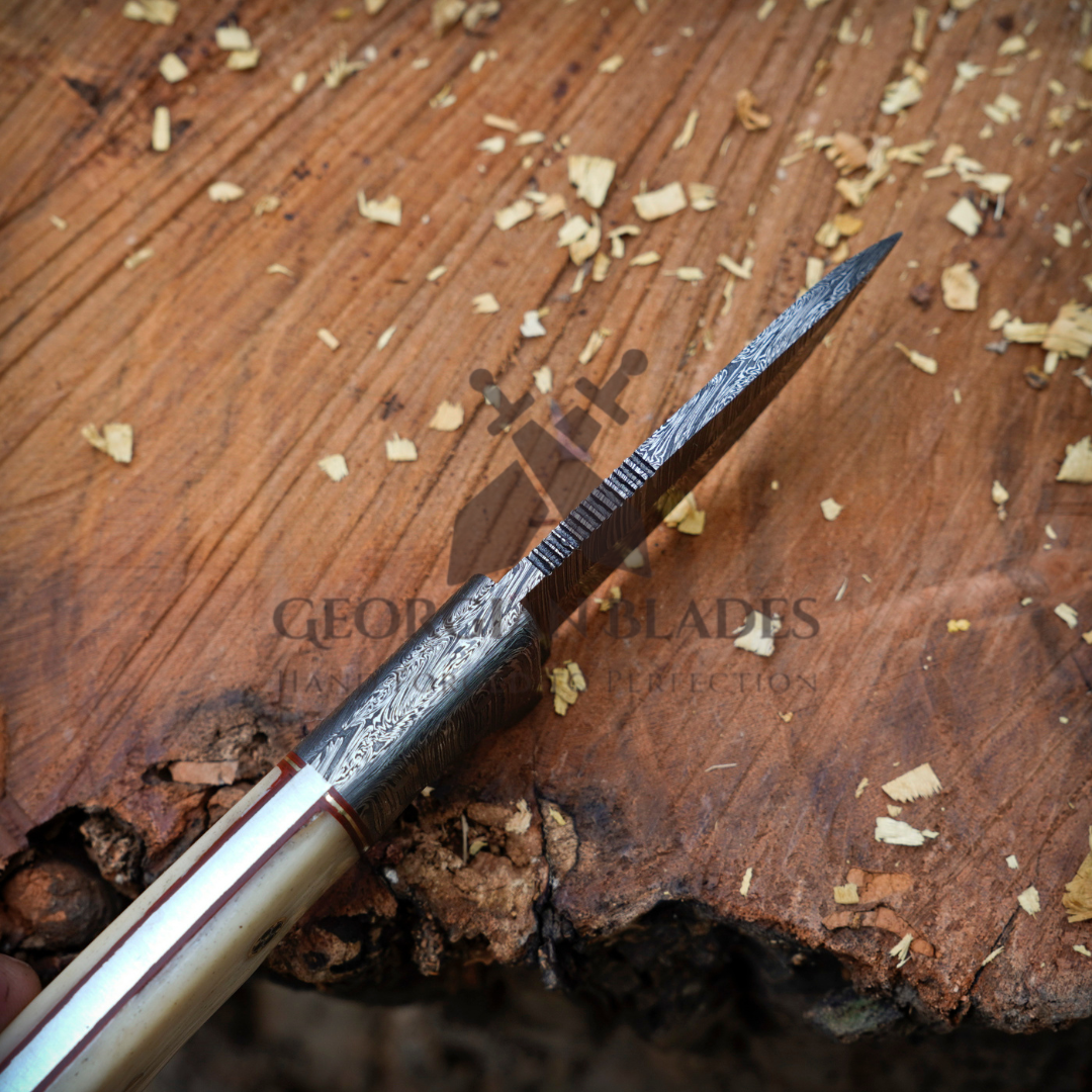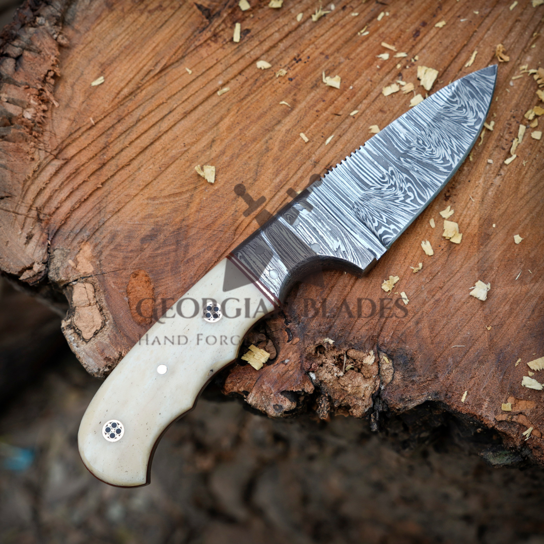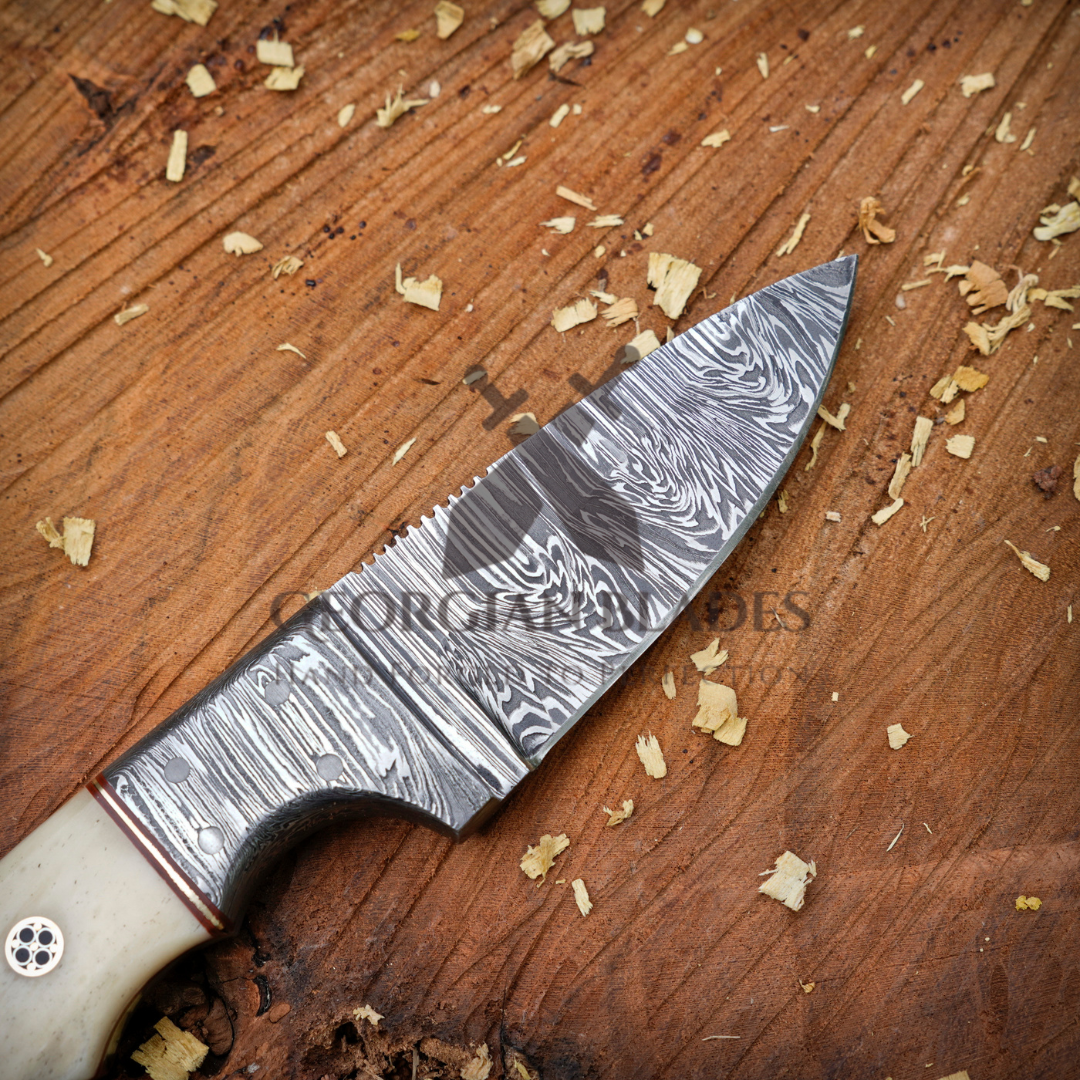 John Henry Slicer - 7.25” Hand Forged Damascus Steel Full Tang Skinner Knife - Camel Bone Handle