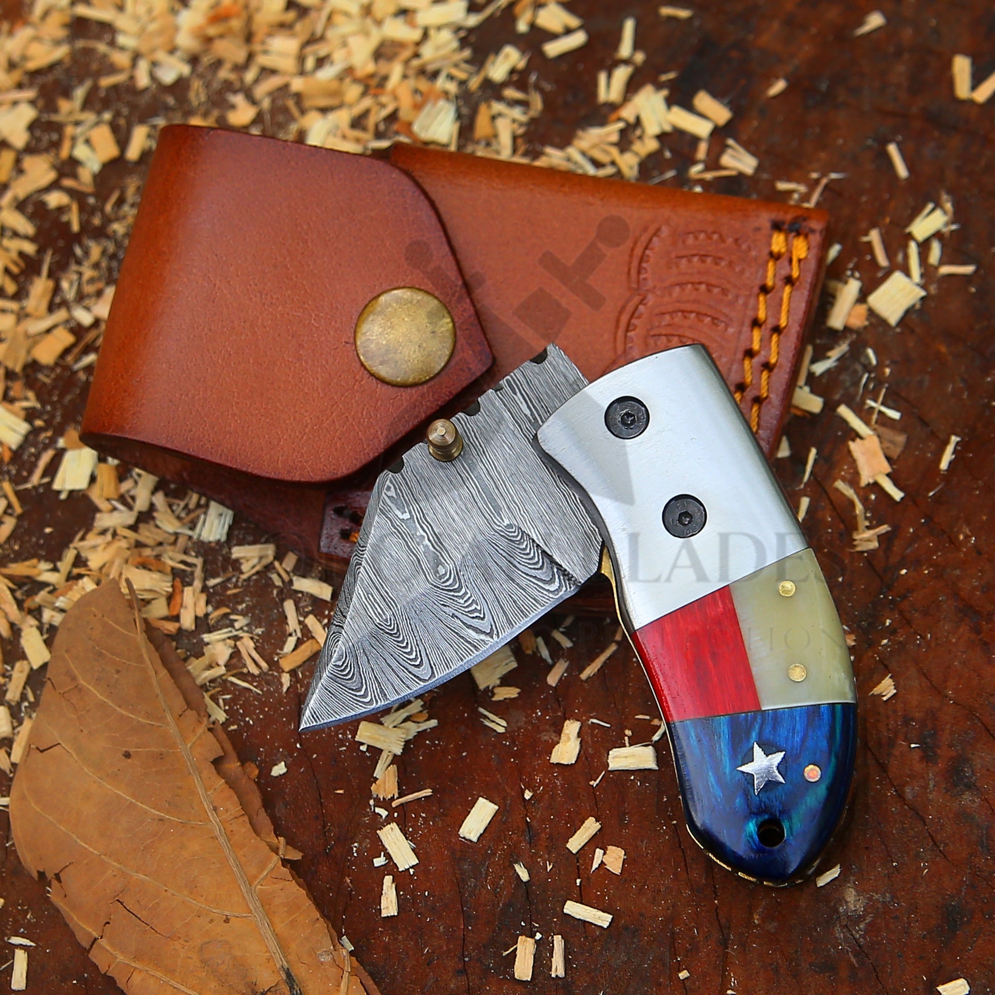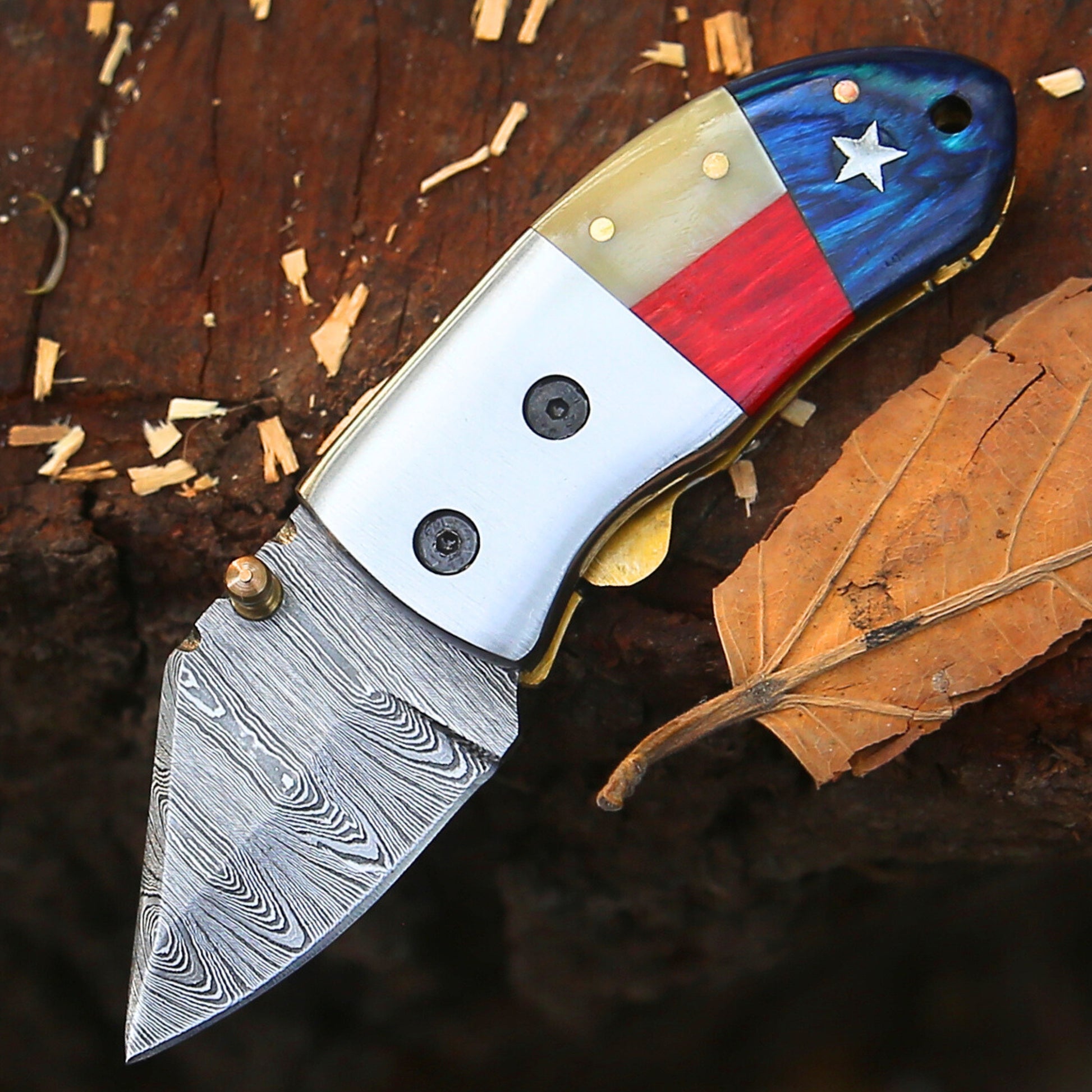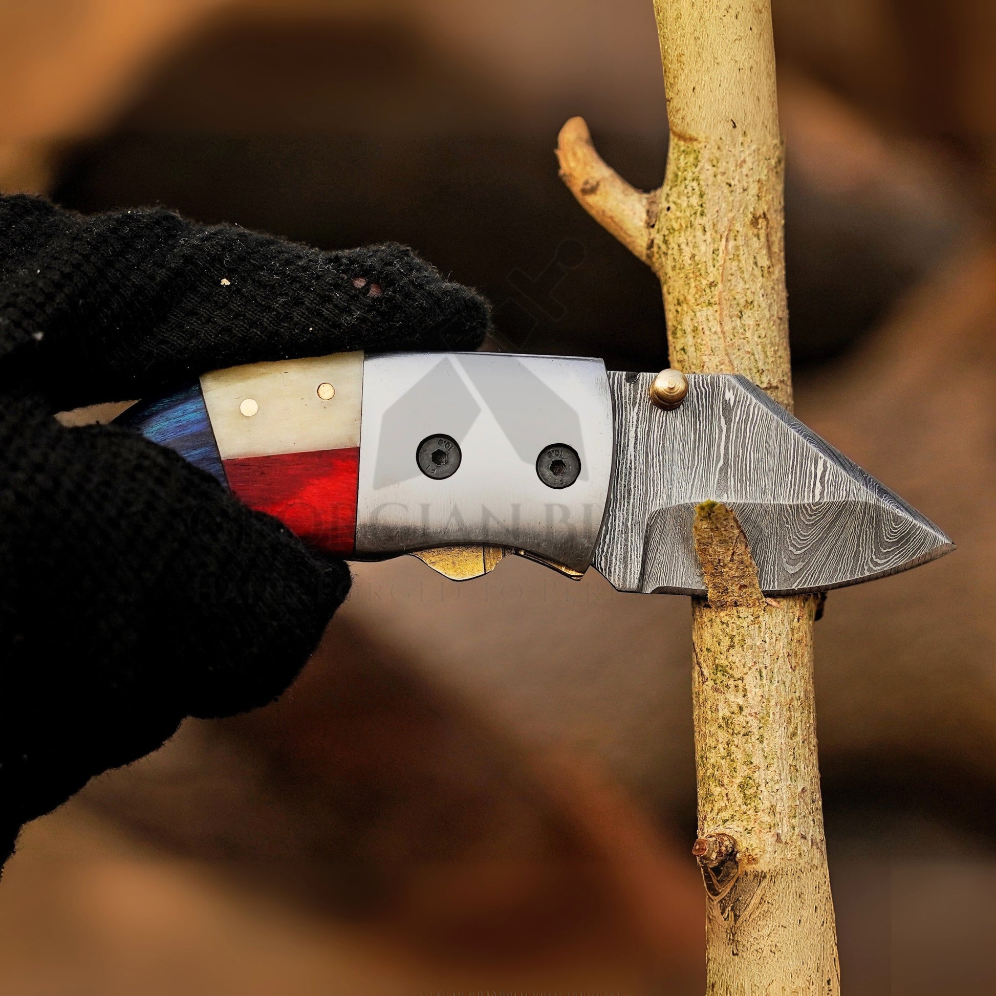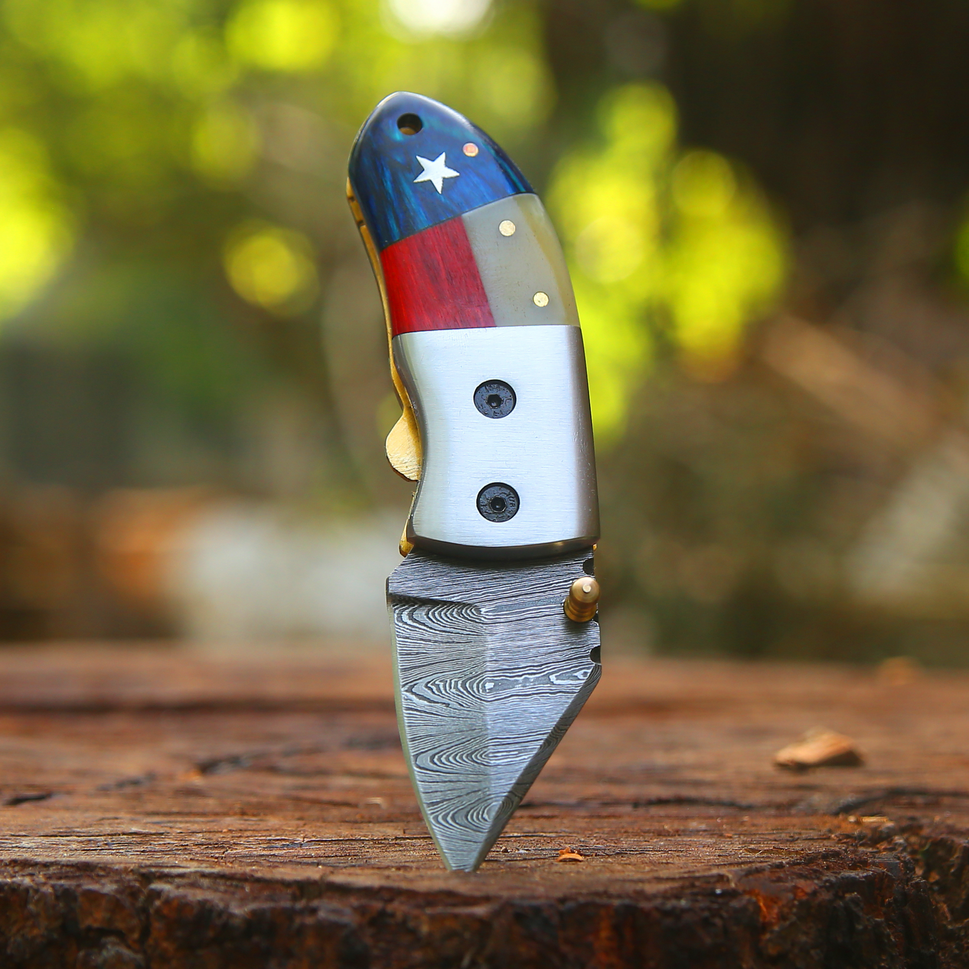 The "Paul Revere Knife" is a tribute to American resilience and ingenuity. This 5 -inch pocket folding knife, featuring a 2-inch twist-patterned Damascus steel blade, echoes the precision and determination of its namesake. The handle, adorned in a USA flag style with a unique blend of bone and resin, is a visual celebration of the nation's spirit. With 288 layers meticulously forged by hand and a hardness of 45-50 HRC, this folding knife is not just a tool; it's a legacy to be passed down. Gift it on special occasions — for grooms, sons, brothers, dads, anniversaries, sisters, and moms — and share a piece of American heritage with those you hold dear.