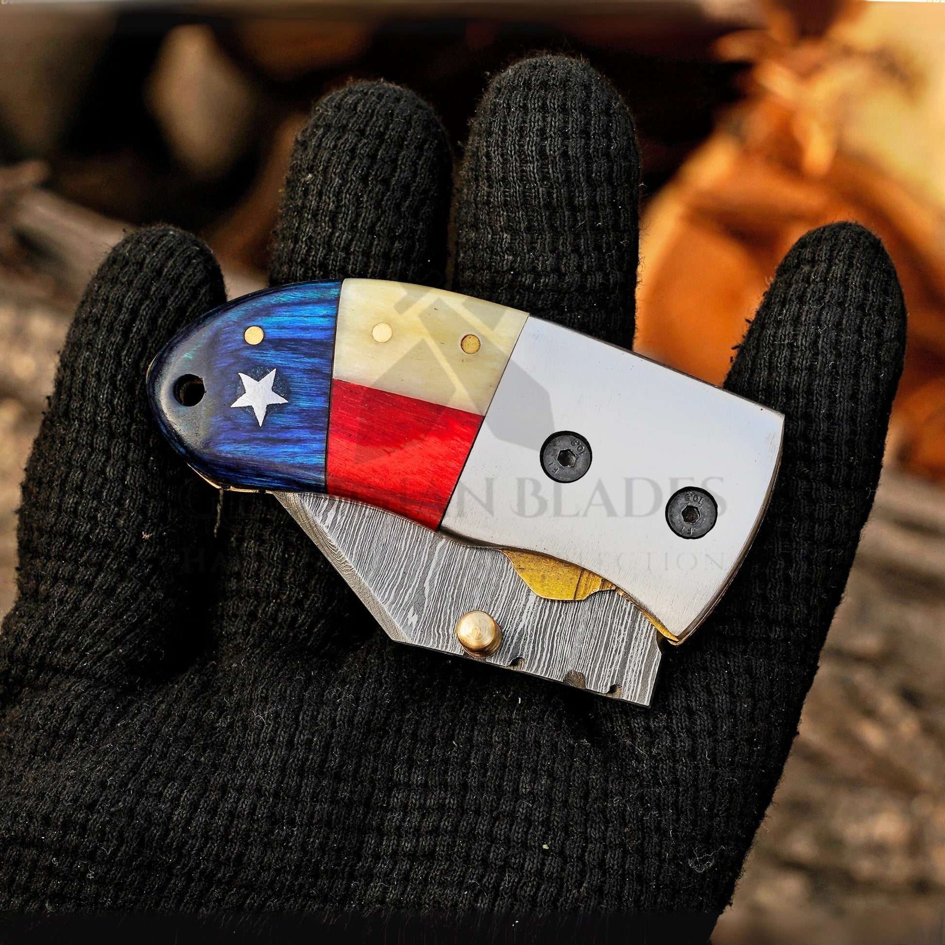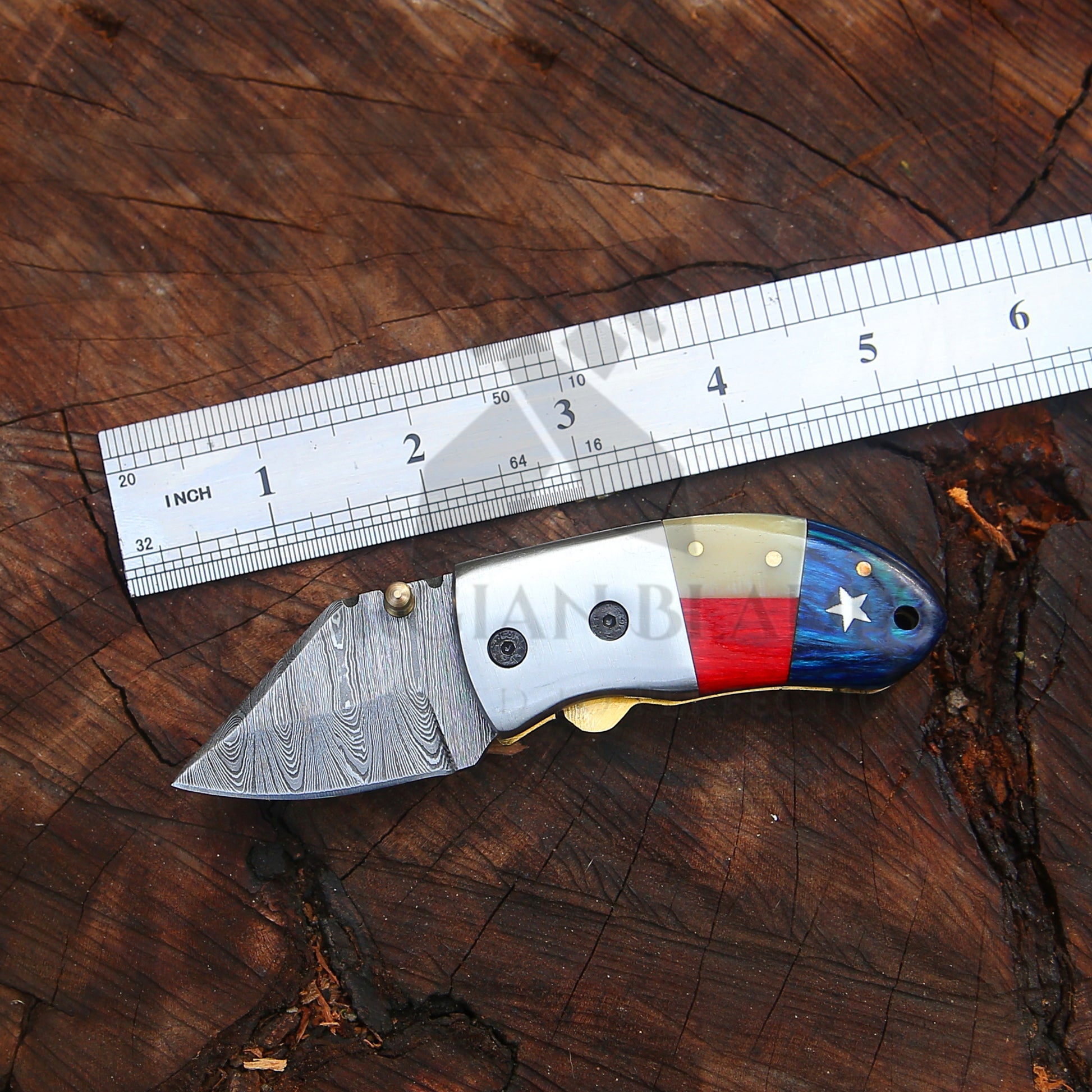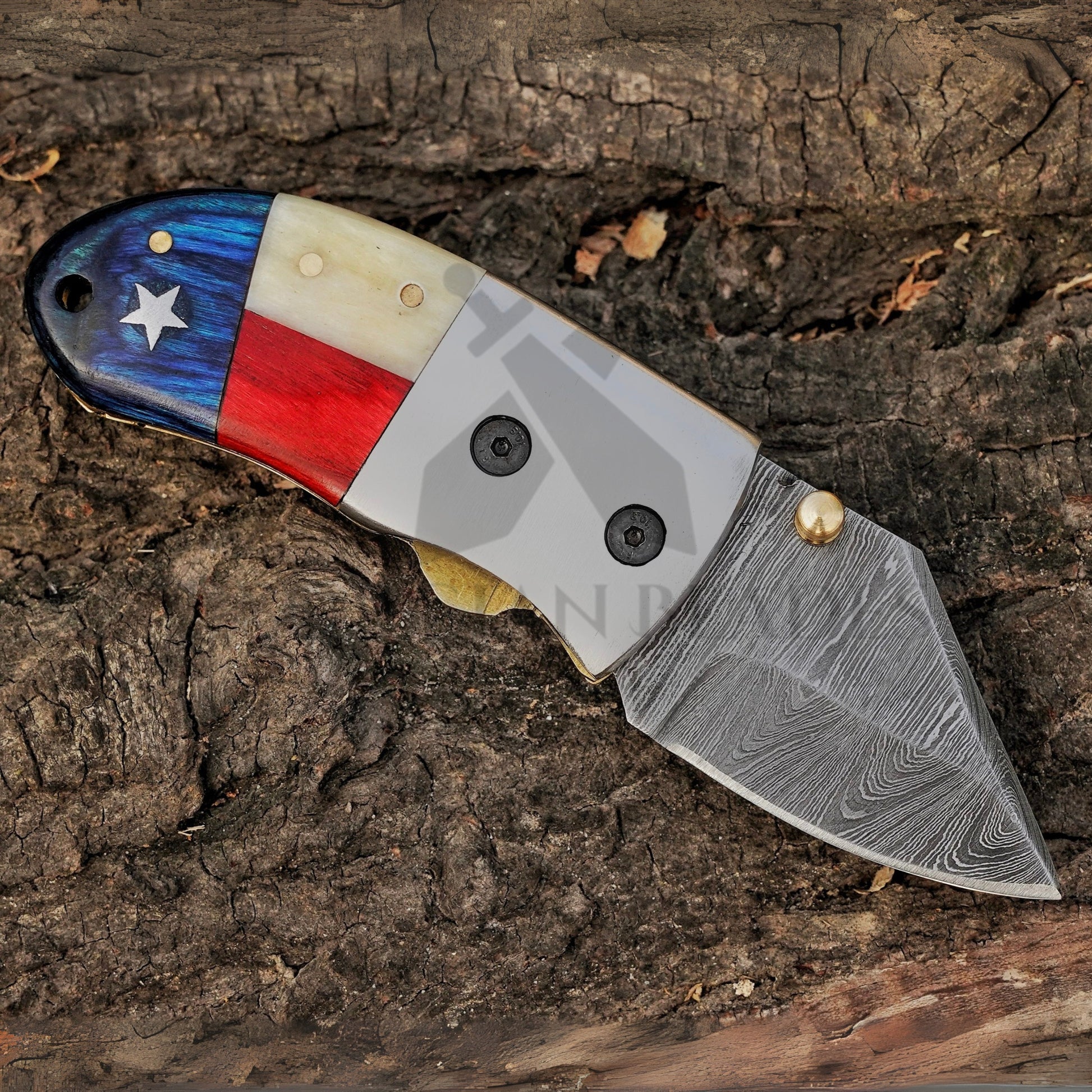 The "Paul Revere Knife" is a tribute to American resilience and ingenuity. This 5 -inch pocket folding knife, featuring a 2-inch twist-patterned Damascus steel blade, echoes the precision and determination of its namesake. The handle, adorned in a USA flag style with a unique blend of bone and resin, is a visual celebration of the nation's spirit. With 288 layers meticulously forged by hand and a hardness of 45-50 HRC, this folding knife is not just a tool; it's a legacy to be passed down. Gift it on special occasions — for grooms, sons, brothers, dads, anniversaries, sisters, and moms — and share a piece of American heritage with those you hold dear.