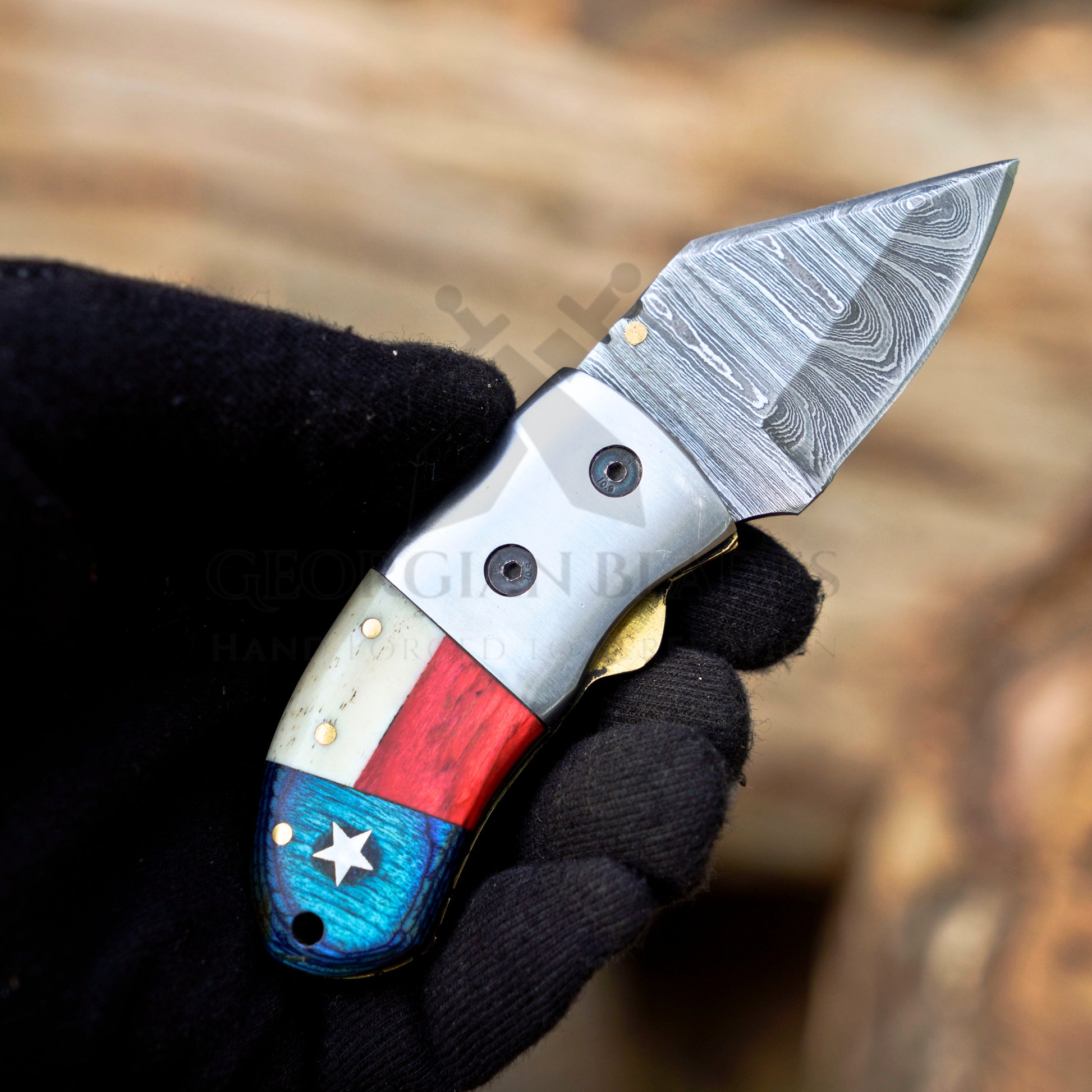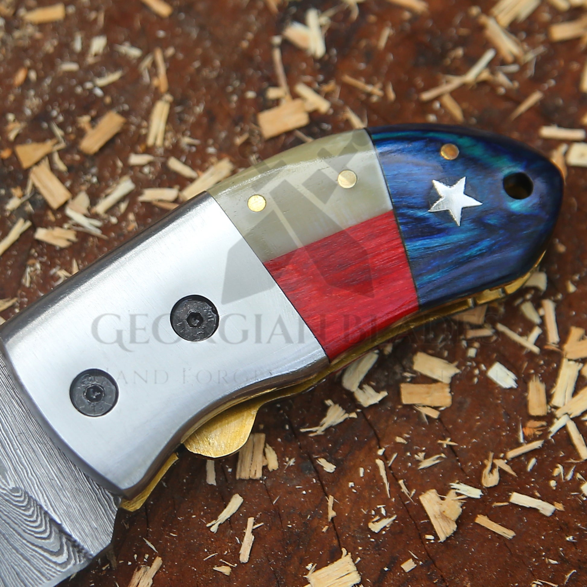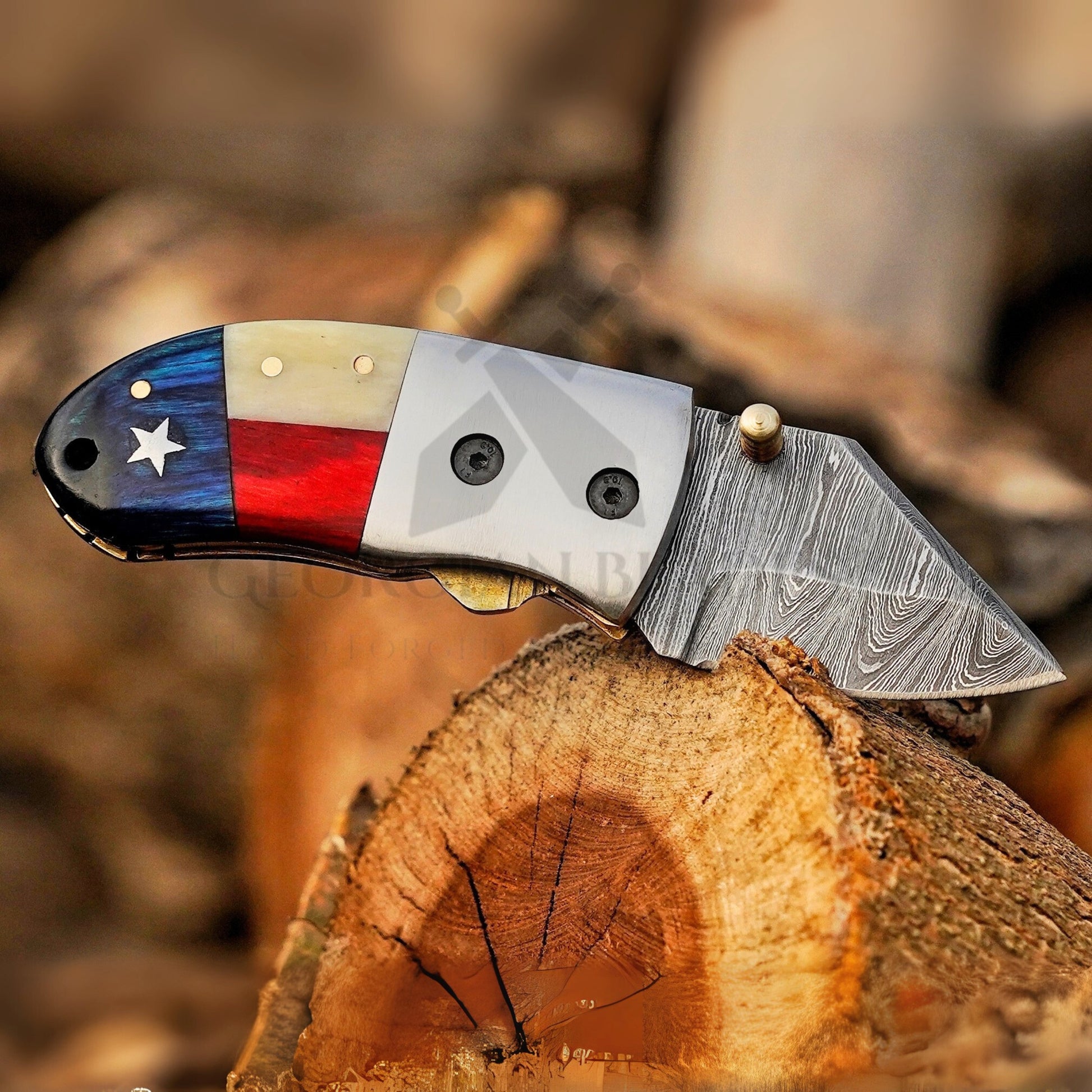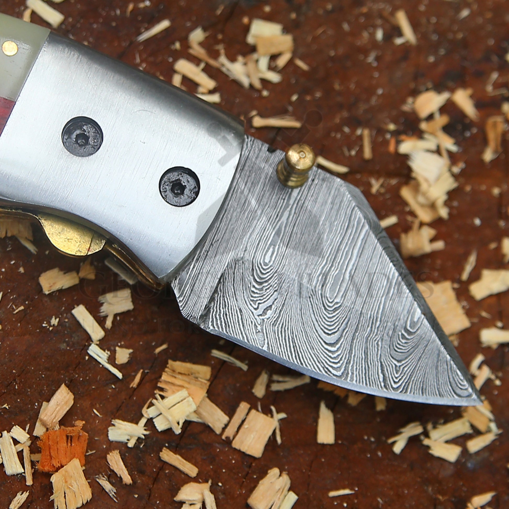 The "Paul Revere Knife" is a tribute to American resilience and ingenuity. This 5 -inch pocket folding knife, featuring a 2-inch twist-patterned Damascus steel blade, echoes the precision and determination of its namesake. The handle, adorned in a USA flag style with a unique blend of bone and resin, is a visual celebration of the nation's spirit. With 288 layers meticulously forged by hand and a hardness of 45-50 HRC, this folding knife is not just a tool; it's a legacy to be passed down. Gift it on special occasions — for grooms, sons, brothers, dads, anniversaries, sisters, and moms — and share a piece of American heritage with those you hold dear.