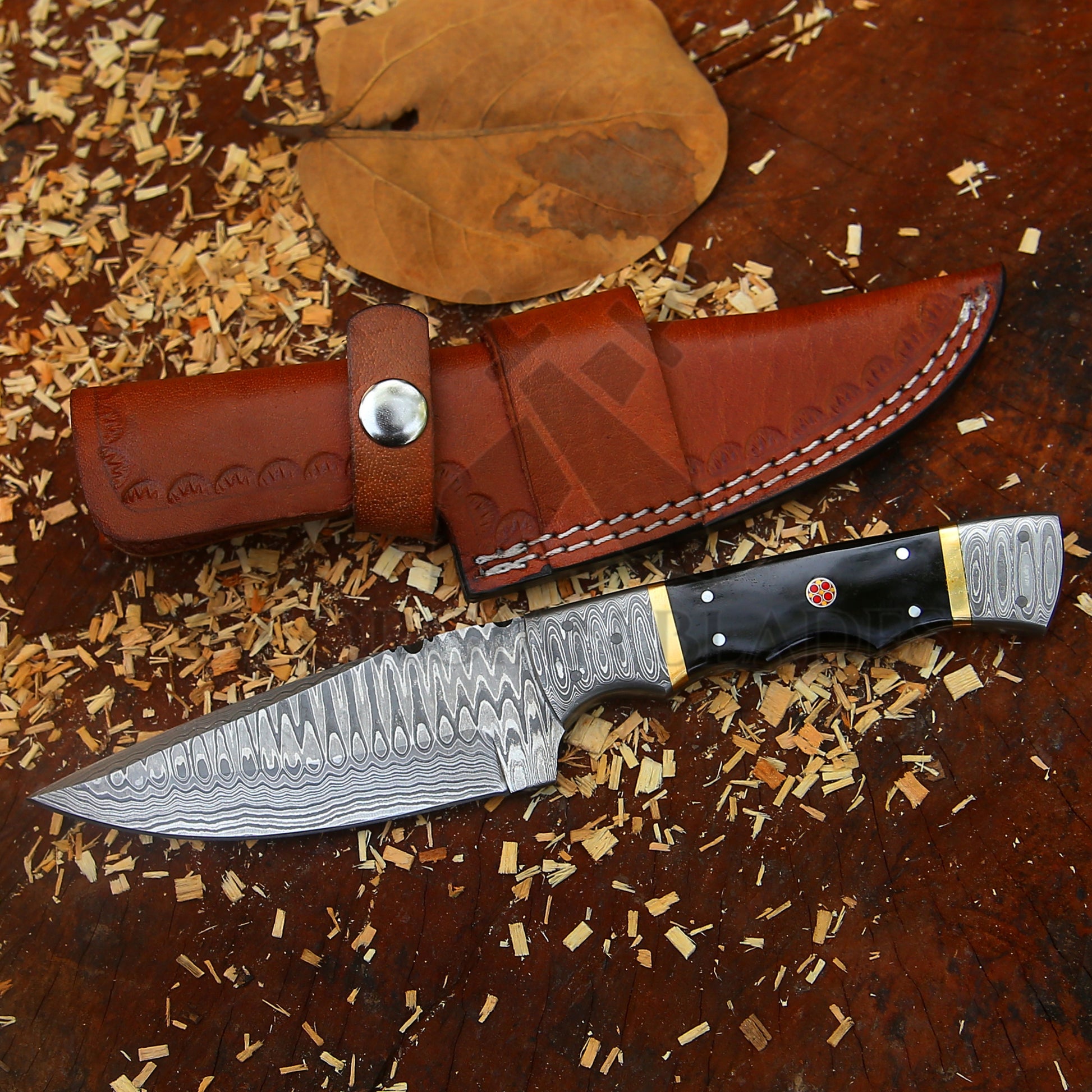 The Thorpe Hunter – 9 inch Hand-Forged Damascus Hunting Knife with Ram Horn Handle and Leather Sheath