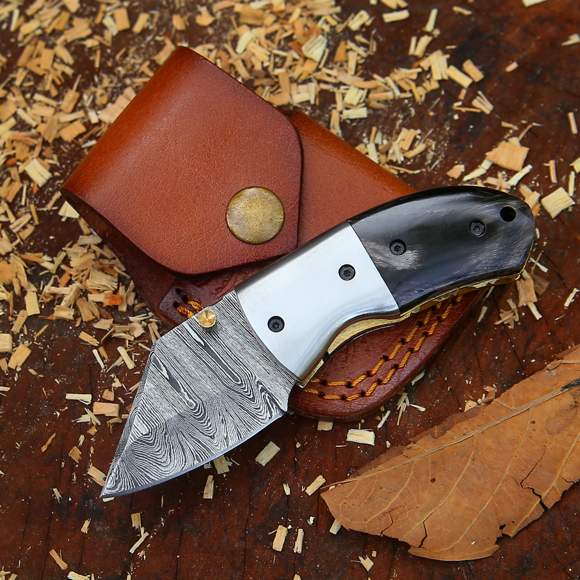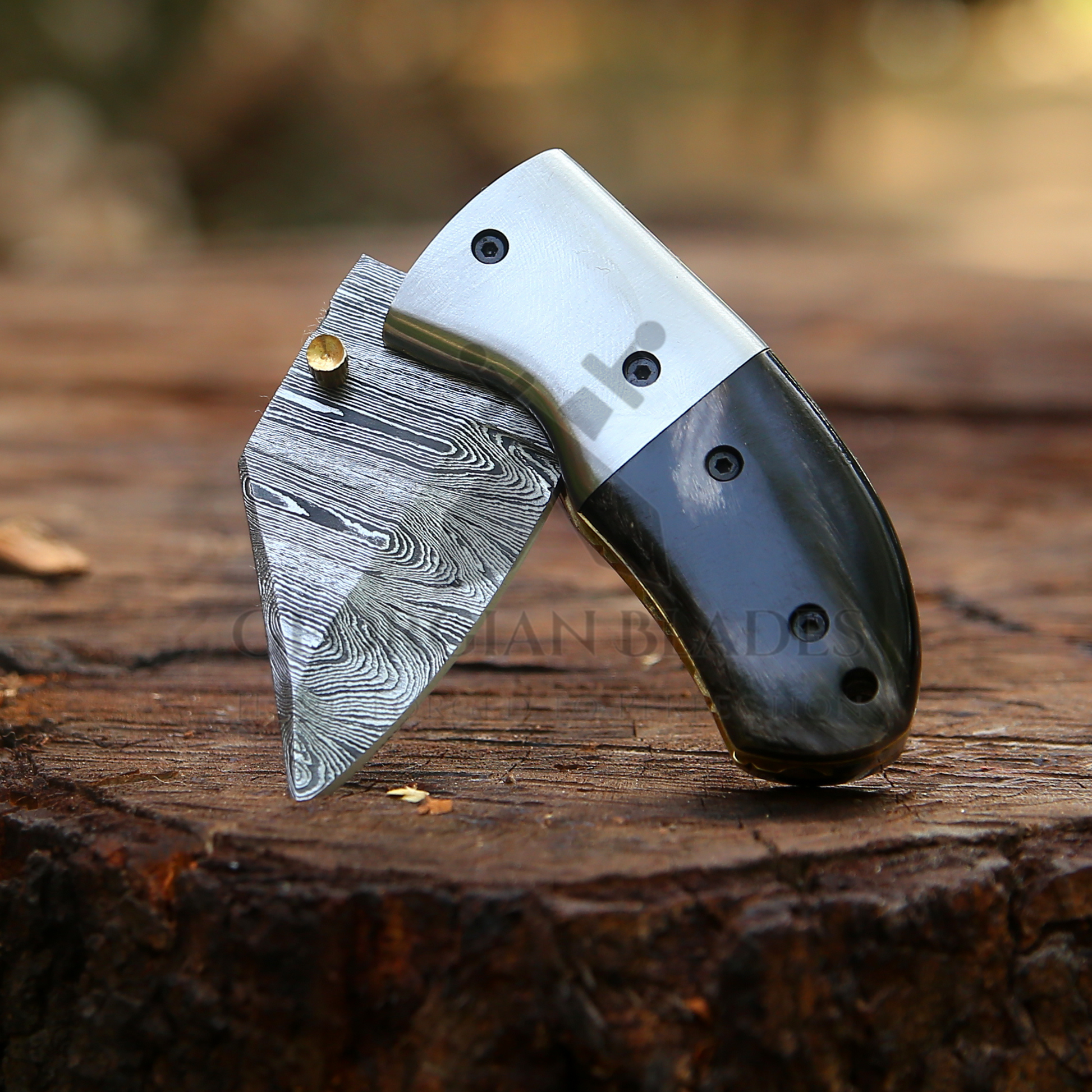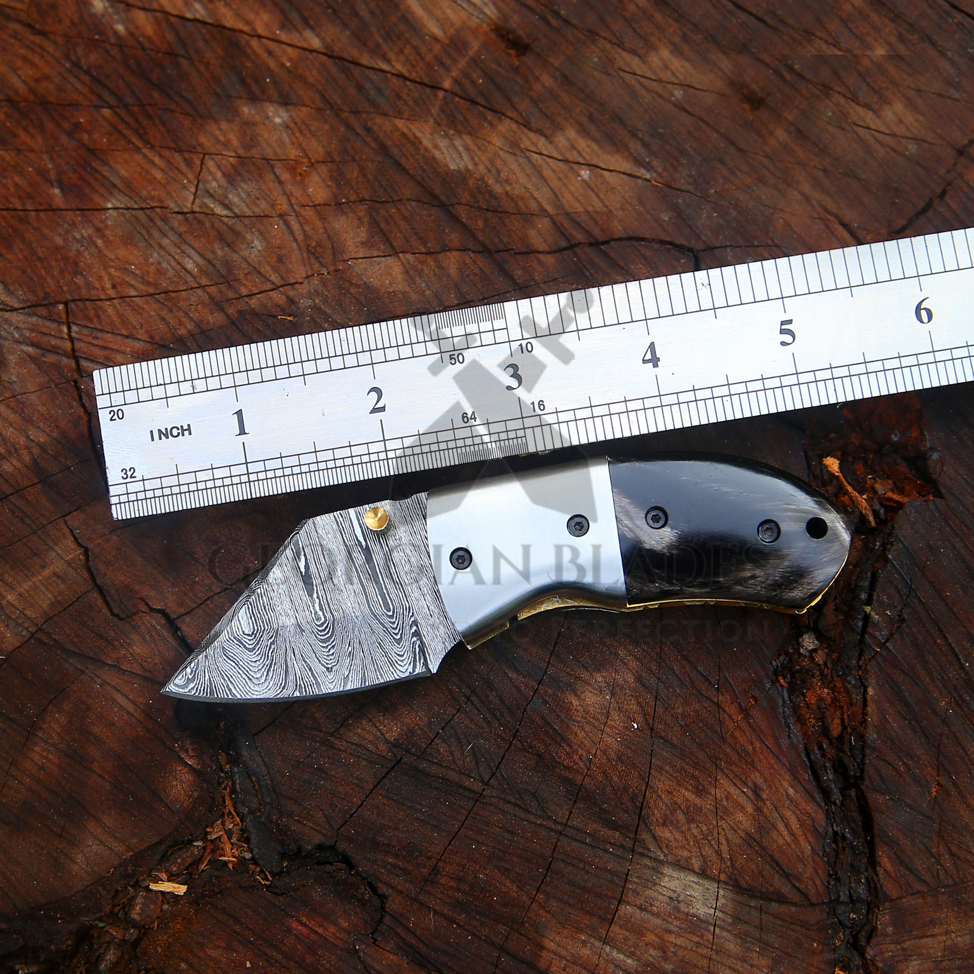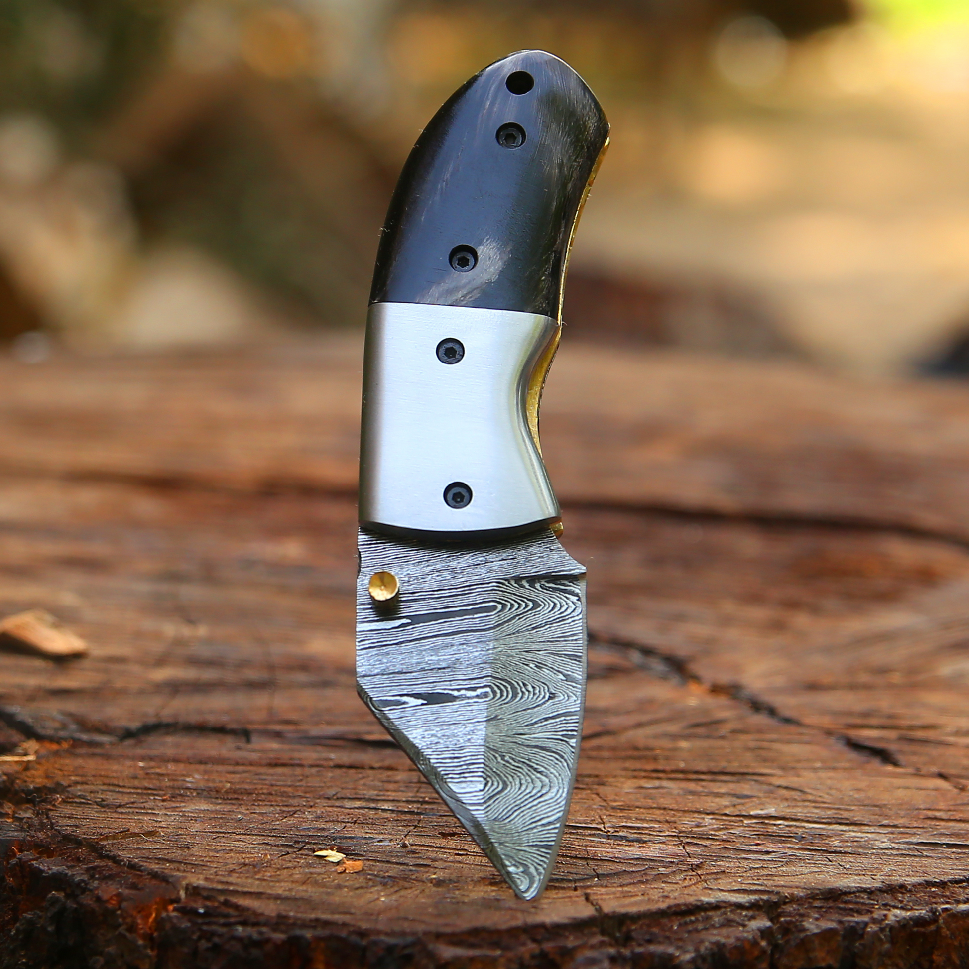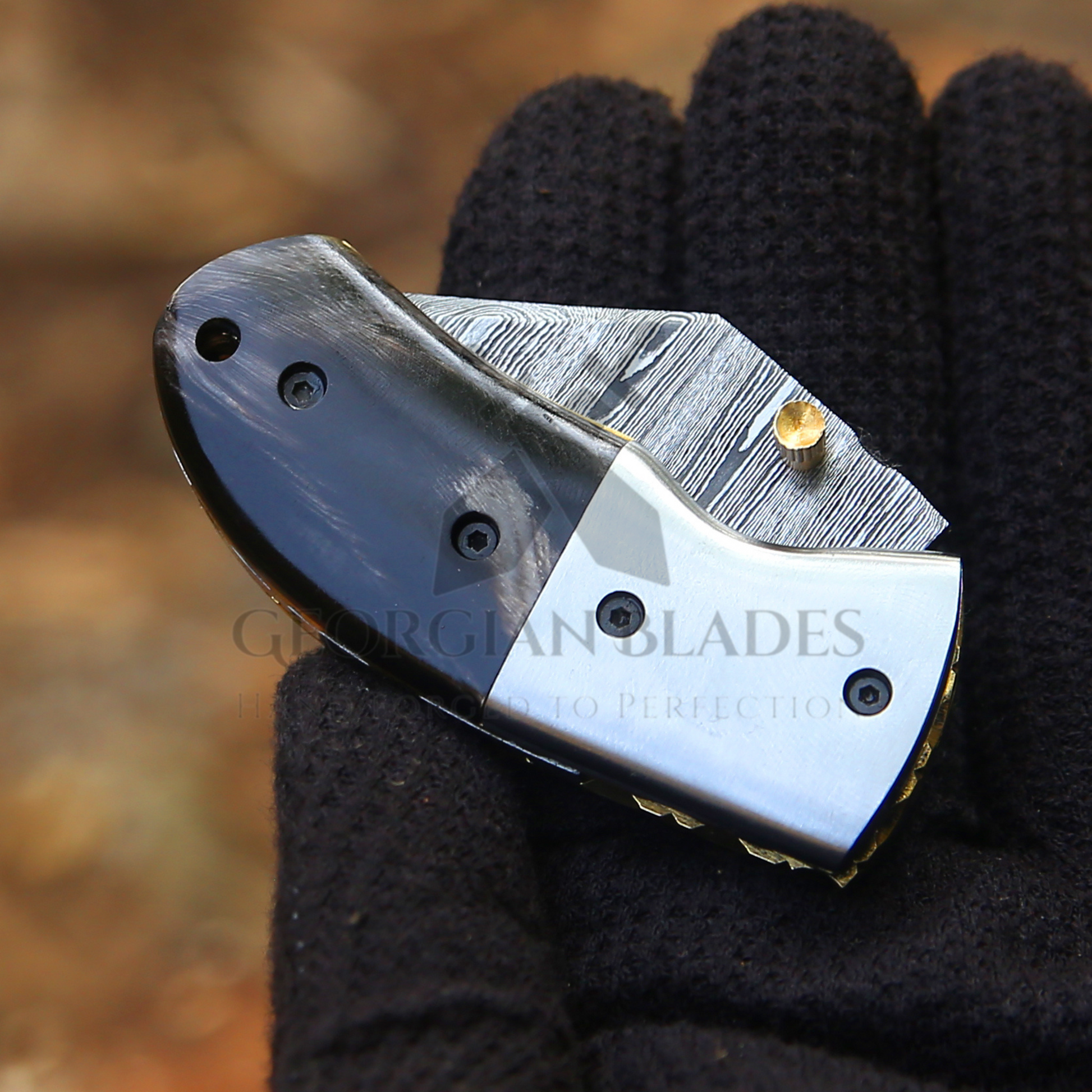 Introducing the "Tiny Torque" – a compact marvel of design, standing at 5.5 inches. This folding knife combines robust durability with refined aesthetics. The 2.5-inch Damascus steel blade, featuring a twist pattern, reflects meticulous craftsmanship, ensuring each cut is precise. The handle, crafted from genuine Bull Horn, offers a secure grip, blending elegance with utility.