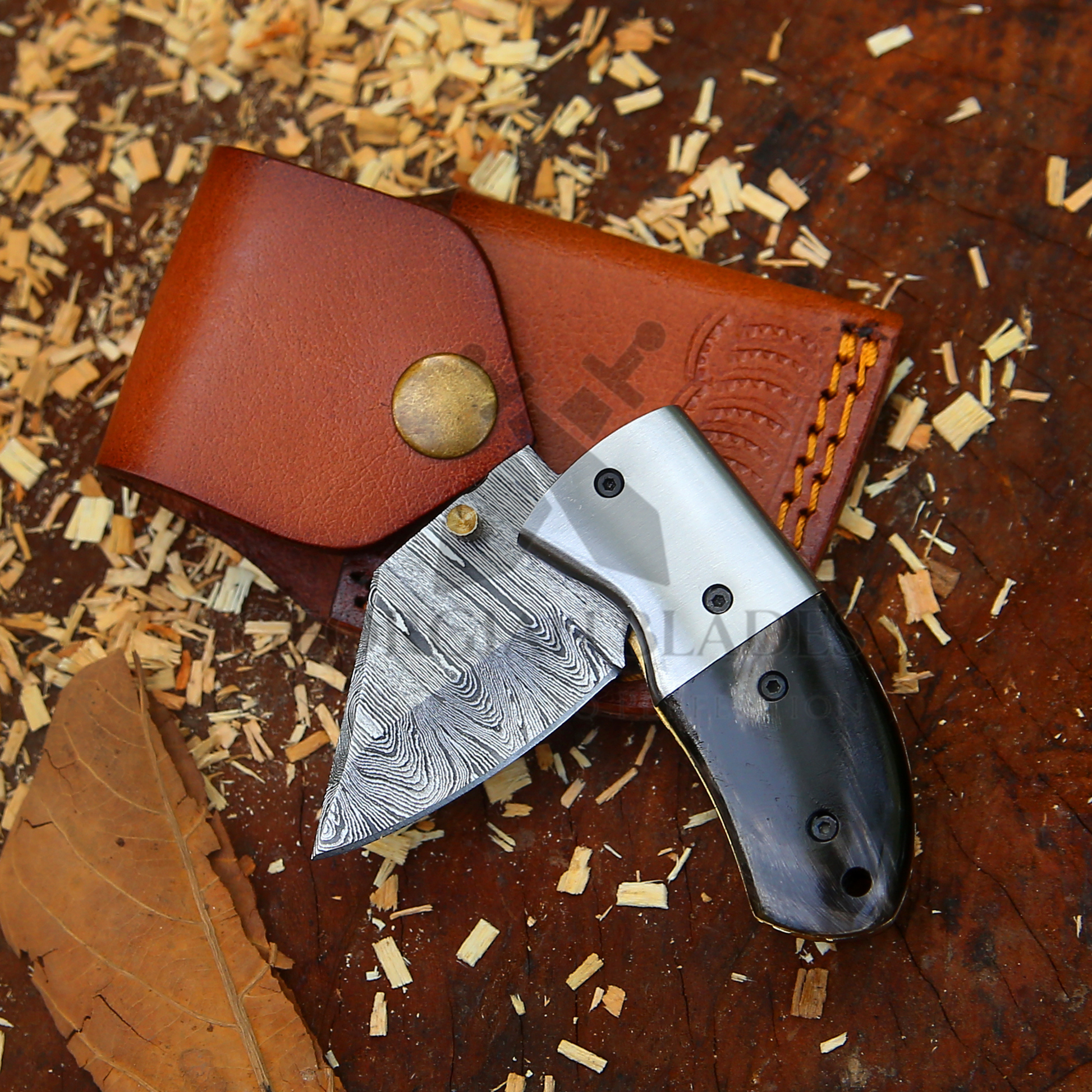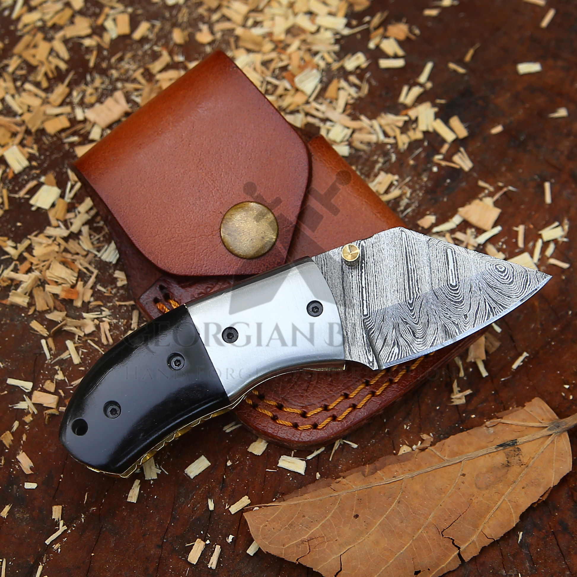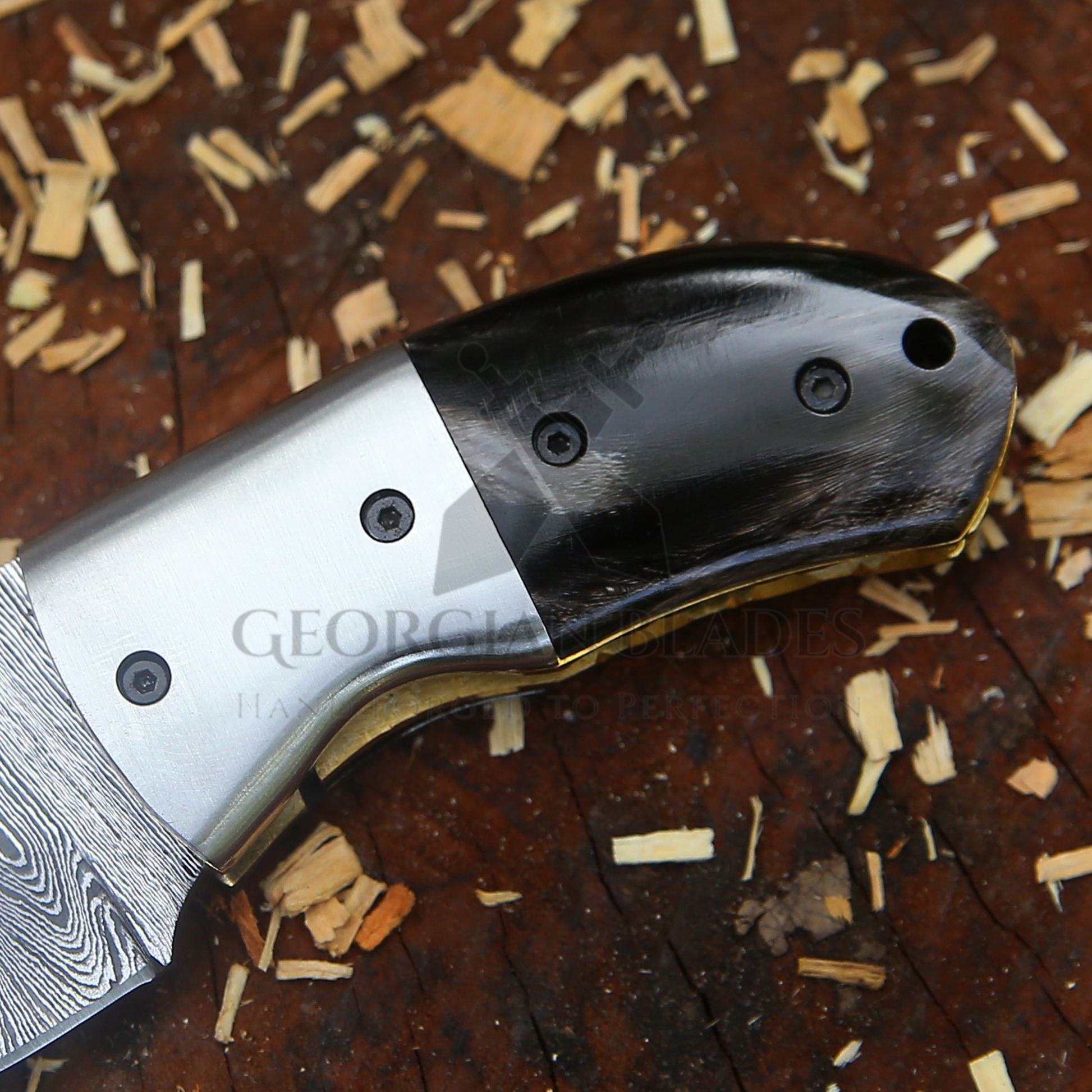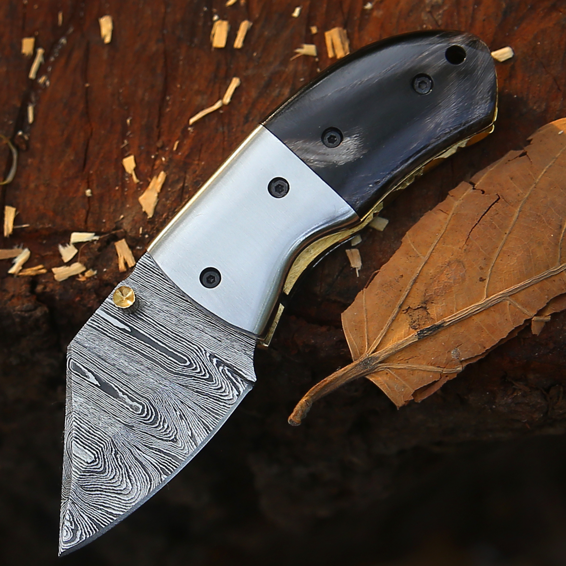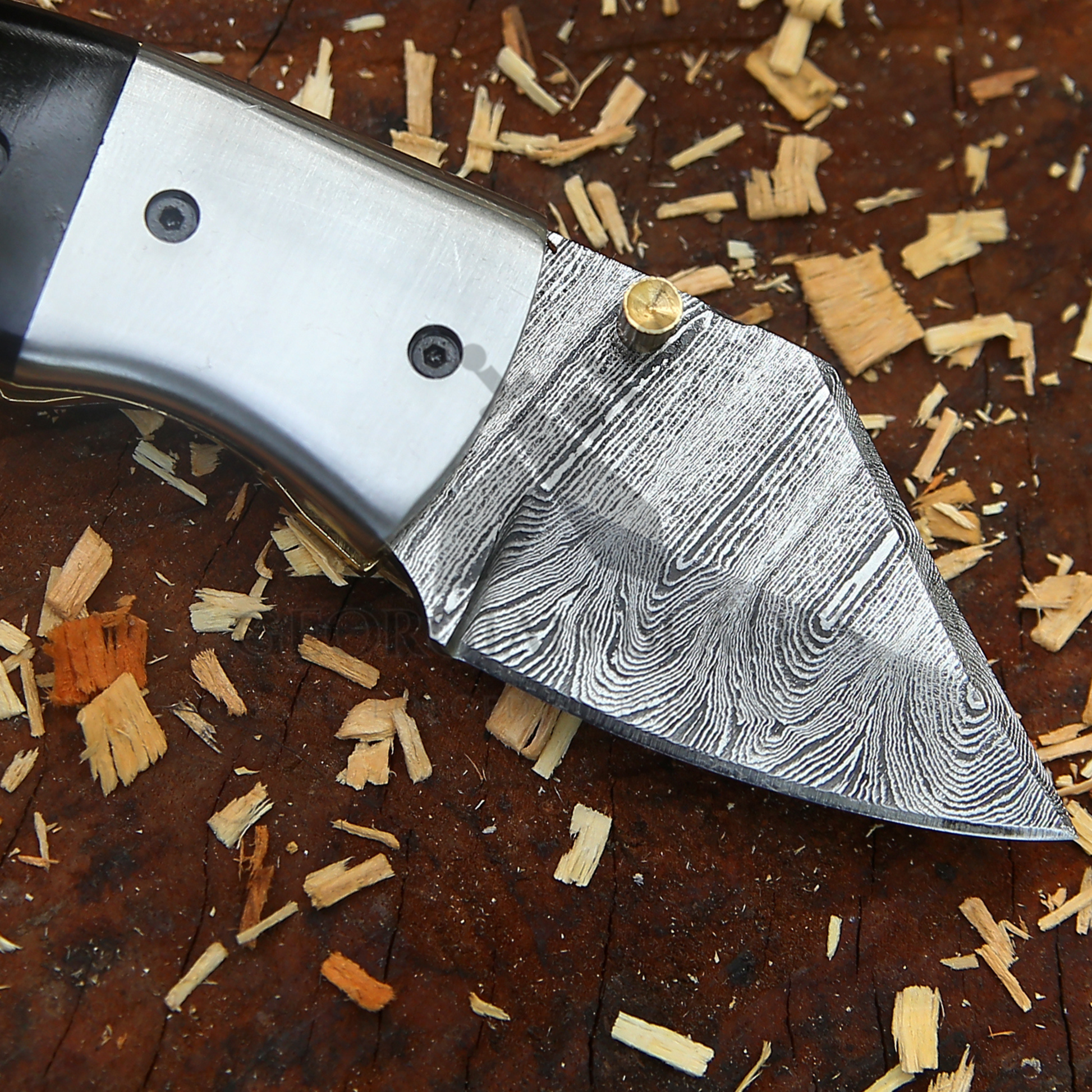 Introducing the "Tiny Torque" – a compact marvel of design, standing at 5.5 inches. This folding knife combines robust durability with refined aesthetics. The 2.5-inch Damascus steel blade, featuring a twist pattern, reflects meticulous craftsmanship, ensuring each cut is precise. The handle, crafted from genuine Bull Horn, offers a secure grip, blending elegance with utility.