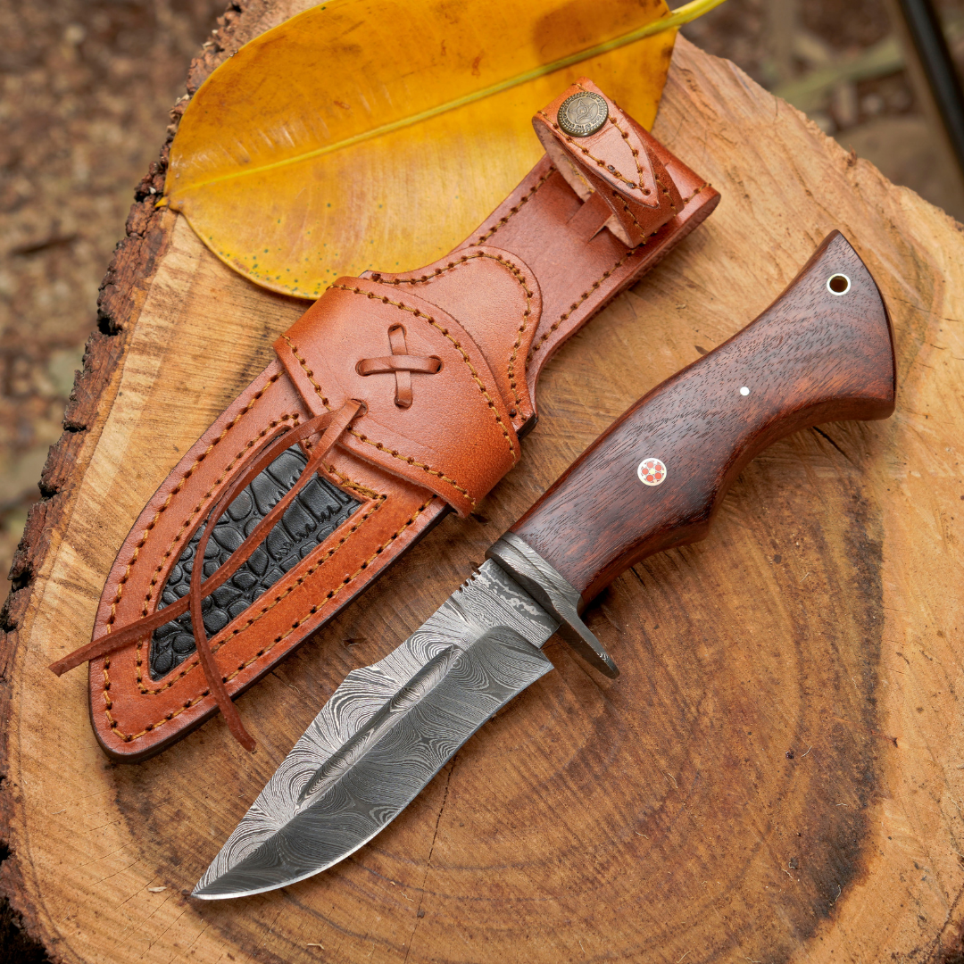 Discover the Woodman's Ally, a meticulously crafted hand-forged Damascus steel knife, perfect for outdoor enthusiasts and collectors alike. Made with 220 layers of stainless and high carbon steel, this knife ensures durability and a sharp edge. Each knife is unique, featuring a beautiful Damascus pattern and a handle made from Rose Wood, complete with brass pins and Damascus guards for an ergonomic grip. The genuine leather sheath provides protection and convenience, allowing for easy carrying. This knife is a fantastic gift for campers, dads, outdoor adventurers, and anyone who appreciates fine craftsmanship. Whether it's for an anniversary, birthday, or special occasion, the Woodman's Ally stands out as a practical yet elegant present.